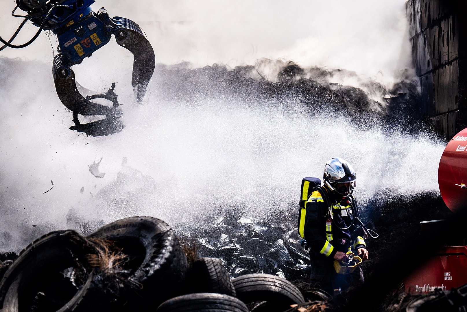 Nach dem Großbrand bei einer Recycling-Anlage in Nußdorf-Debant im Bezirk Lienz läuft der Großeinsatz weiter. Aktuell sind rund 120 Einsatzkräfte im Einsatz. Der Brand ist unter Kontrolle – seitens der Einsatzkräfte werden aktuell die Abfallhaufen abgetragen und Glut- und Brandnester abgelöscht. Bundesminister Norbert Totschnig und Sicherheitslandesrätin Astrid Mair waren heute, Montagnachmittag, vor Ort, um sich ein Bild des Einsatzes zu machen und sich bei den Einsatzkräften zu bedanken.