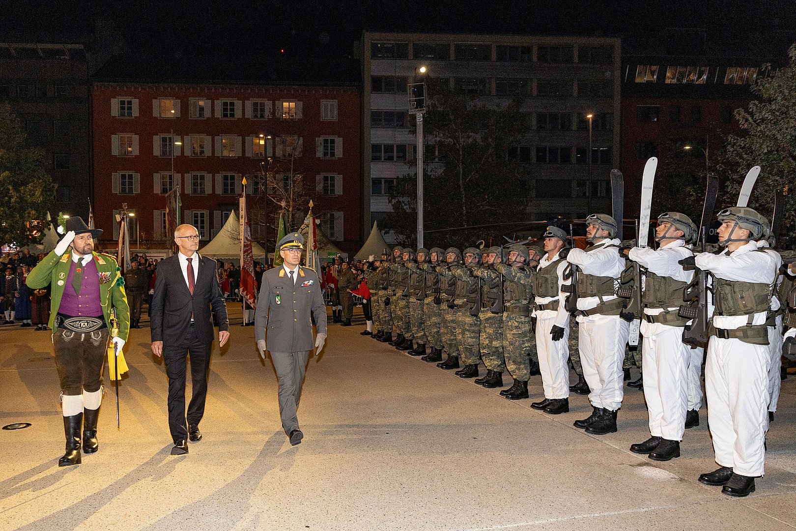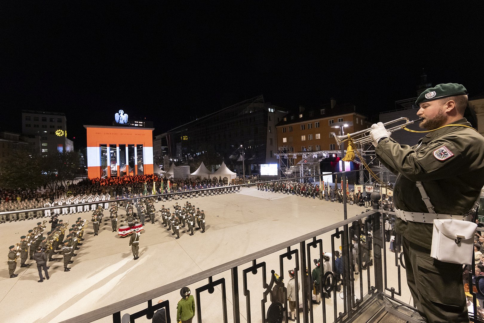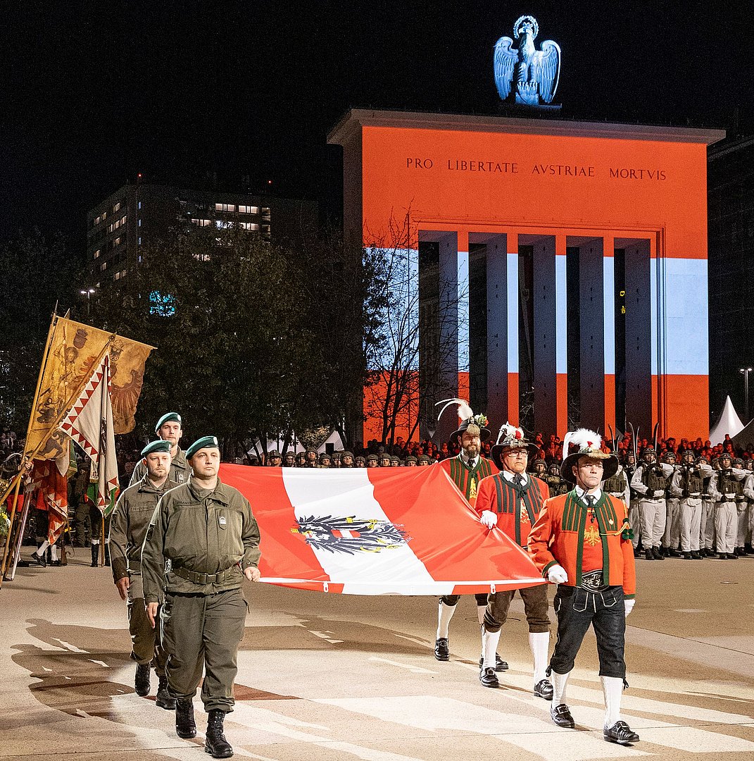 Am Vorabend zum Nationalfeiertag wurde wieder der traditionelle Große Österreichische Zapfenstreich am Landhausplatz in Innsbruck abgehalten: Neben der Militärmusik Tirol war die Führungsunterstützungskompanie des Stabsbataillon 6 des Österreichischen Bundesheeres, die Musikkapelle und die Ehrenkompanie Steeg, Abordnungen des Schützenbataillons Lechtal und der Tiroler Traditionsverbände sowie der Offizierskurs des Bundes der Tiroler Schützenkompanien und eine Abordnung des Tiroler Kameradschaftsbunds anlässlich der Festsitzung 140 Jahre Tiroler Kameradschaftsbund ausgerückt. LH Anton Mattle erinnerte in seiner Rede an die Bedeutung des Nationalfeiertages und das Zusammengehörigkeitsgefühl in Tirol: