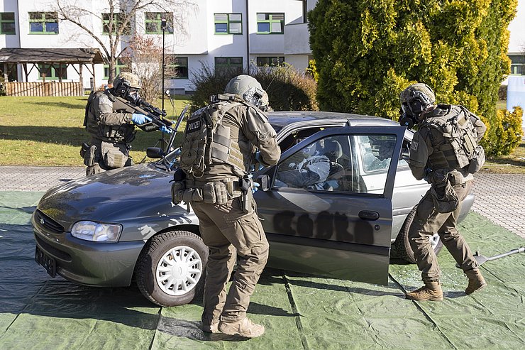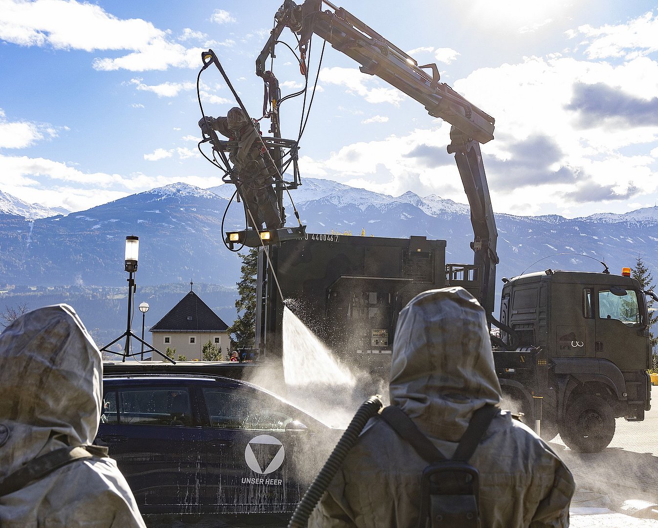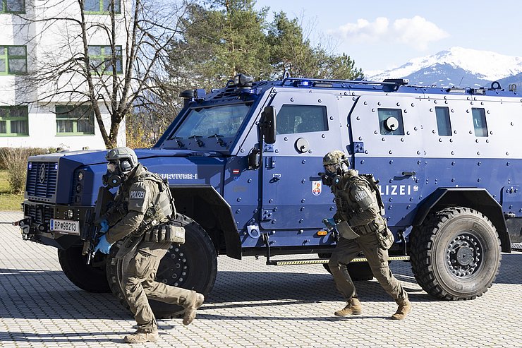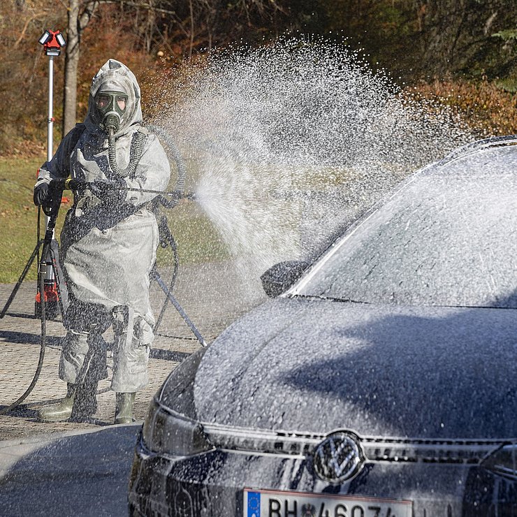 Auch beim nächsten Szenario der Leistungsschau handelte es sich um einen Vorfall mit Strahlenbelastung: Einsatzkräfte und Strahlenschutzexperten der Polizei-Spezialeinheit EKO Cobra und gefahrenstoffkundige Organe der Landespolizeidirektion Tirol übten den Zugriff bei einem illegalen „Deal“ mit radioaktiven Material. Ebenfalls mit spezieller Schutzbekleidung und Atemschutzgeräten ausgerüstet, mussten die Einsatzkräfte zwei mutmaßliche Täter überwältigen und die Gefahrenstelle absichern. Als Abschluss der Leistungsschau dekontaminierten Spezialkräfte des Österreichischen Bundesheeres, die sogenannte ABC-Abwehrkompanie, das kontaminierte Fahrzeug der Täter. „Für solche Dekontaminierungsmaßnahmen verfügen wir neben geschulten Soldatinnen und Soldaten sowie besonderer Ausrüstung auch über ein Spezialfahrzeug, den ‚Mammut‘“, erklärt Militärkommandant Gstrein und führt aus: „Einsätze in Zusammenhang mit Strahlung sind immer eine besondere Herausforderung für die Einsatzkräfte. Zum Selbstschutz ist Spezialausrüstung unabdingbar. Diese schränkt jedoch das Sichtfeld und die Bewegungsfreiheit ein. Umso wichtiger ist es, Einsätze regelmäßig in Ausrüstung zu proben, um alle Handgriffe zu verinnerlichen.“