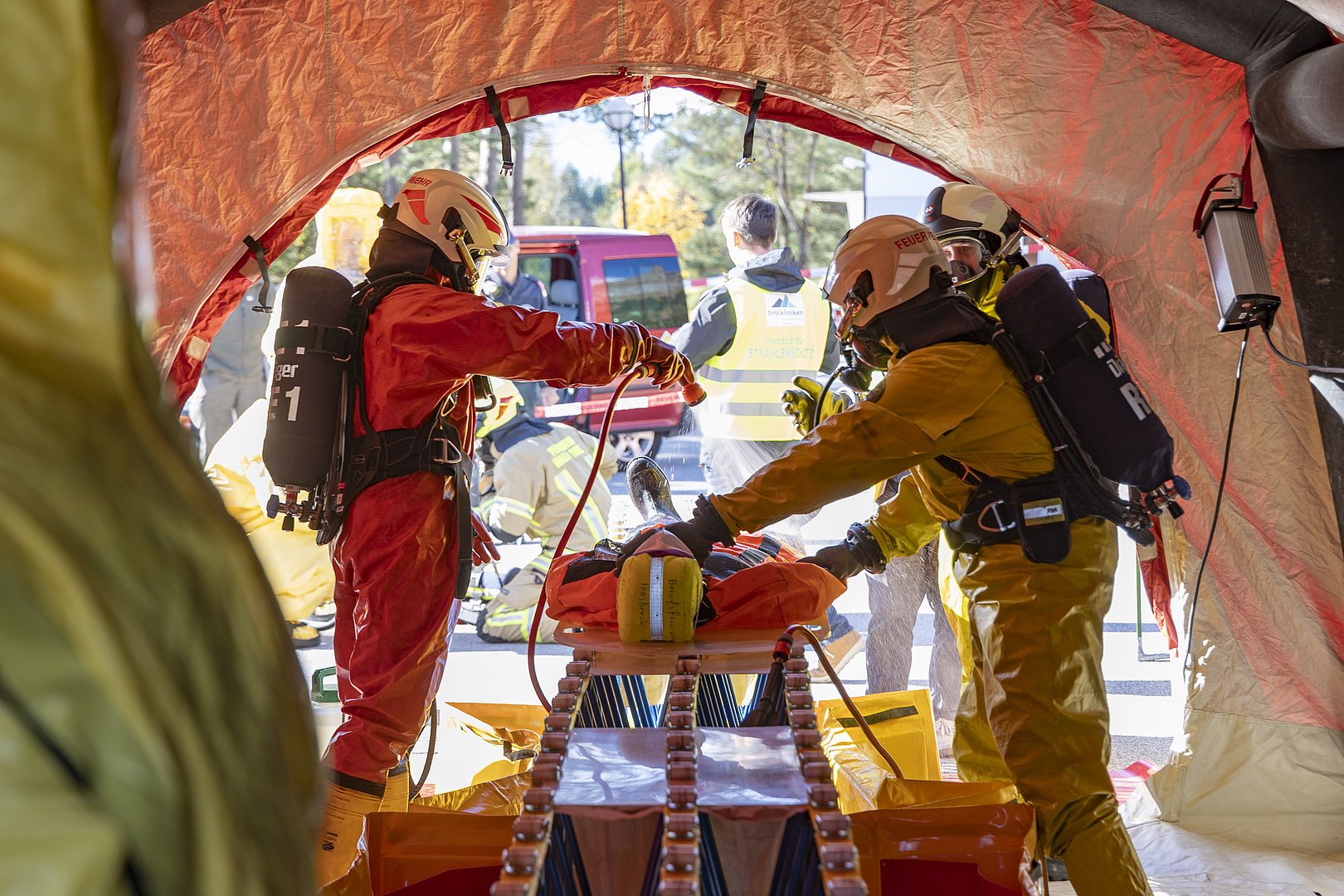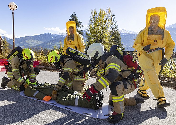 Zunächst wurden durch ExpertInnen des Landes Proben von der Umgebung – unter anderem von Pflanzen und aus dem Boden – entnommen. Anschließend bestimmten MitarbeiterInnen des Institutes für Strahlenschutz und Dosimetrie mit Hilfe von speziellen Messgeräten – einem sogenannten Gammaspektrometer – die Strahlenbelastung vor Ort. Das nächste Szenario sah den Unfall eines Fahrzeuges, welches radioaktives Material transportiert, vor. Mitglieder des Strahlenspürtrupps Innsbruck-Land, der Freiwilligen Feuerwehr Reichenau und der Berufsfeuerwehr Innsbruck, ausgerüstet mit Strahlenschutzkleidung und Atemschutzausrüstung, erkundeten die Unfallstelle, nahmen Messungen vor und bargen den bewusstlosen Fahrer des Fahrzeuges. Bevor dieser den Rettungskräften zur weiteren Behandlung übergeben werden konnte, musste der Verletzte dekontaminiert werden – also von Rückständen radioaktiven Materials befreit werden.