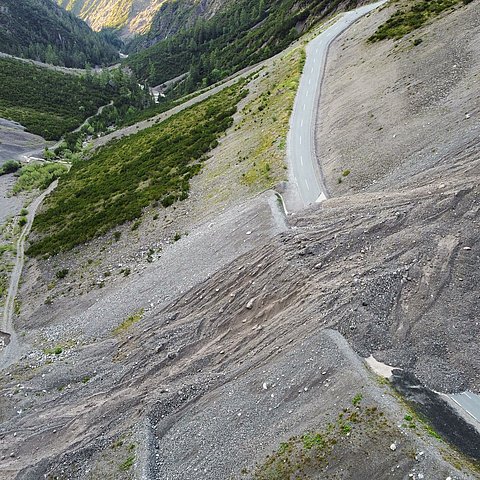 Auf dem Bild ist die Hantennjochstraße zu sehen. Eine Steinlawine bedeckt die Fahrbahn.