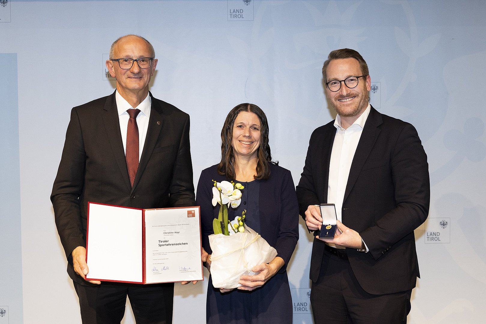 © Land Tirol/W9 Mario Webhoferv.l.n.r.: LH Anton Mattle, Christine Mayr, 1.LH-Stv. Philip Wohlgemuth© Land Tirol/W9 Mario Webhofer