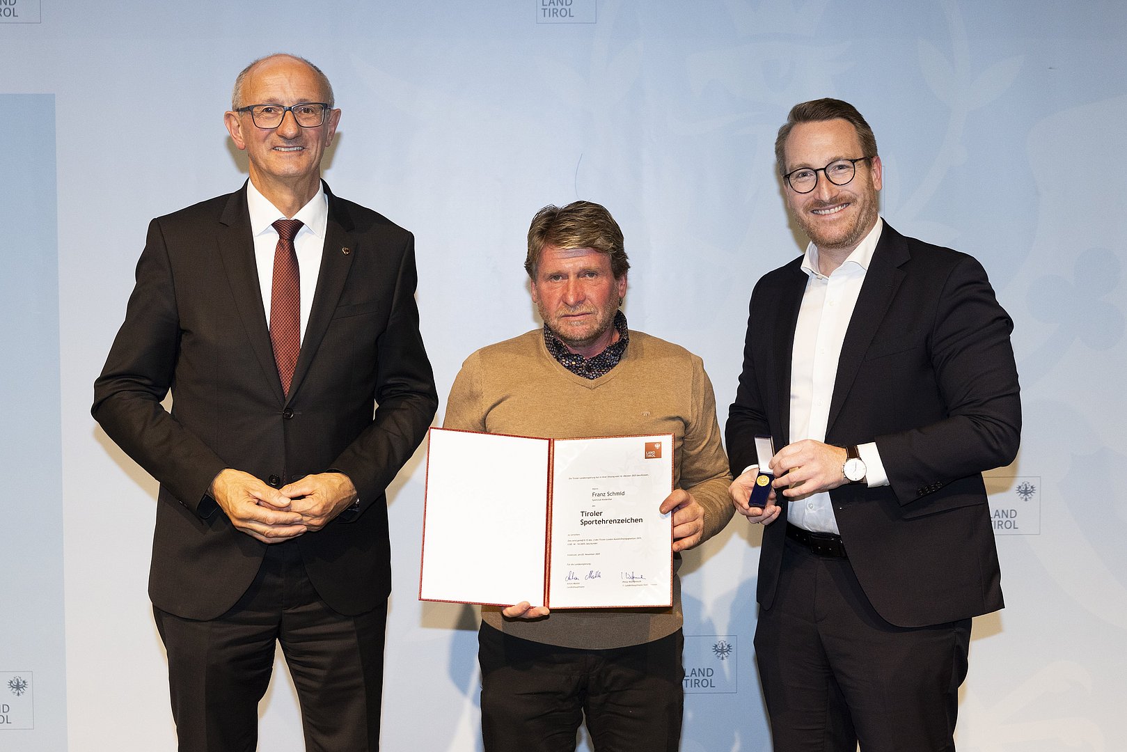 © Land Tirol/W9 Mario Webhoferv.l.n.r.: LH Anton Mattle, Franz Schmid, 1.LH-Stv. Philip Wohlgemuth© Land Tirol/W9 Mario Webhofer