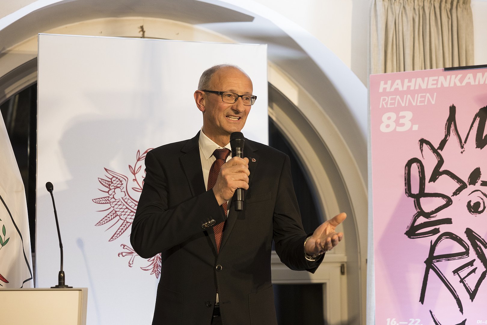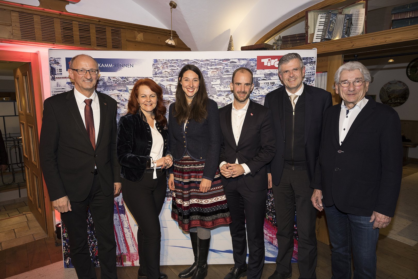 Die Hahnenkamm-Rennen in Kitzbühel begeistern alljährlich tausende Sportbegeisterte aus aller Welt. Nach zweijähriger Pause fand heuer auch wieder traditionell der Kitzbühel-Empfang des Landes Tirol statt. LH Anton Mattle lud anlässlich dazu in die „Goldene Gams“ inmitten der Kitzbüheler Altstadt ein, um gemeinsam mit Roswitha Stadlober, Präsidentin des Österreichischen Skiverbands, und Michael Huber, Präsident des Kitzbüheler Ski Clubs, das Renn-Wochenende offiziell zu eröffnen. Neben Mitgliedern der Tiroler Landesregierung fanden sich rund 100 geladene Gäste in der „Goldenen Gams“ ein.