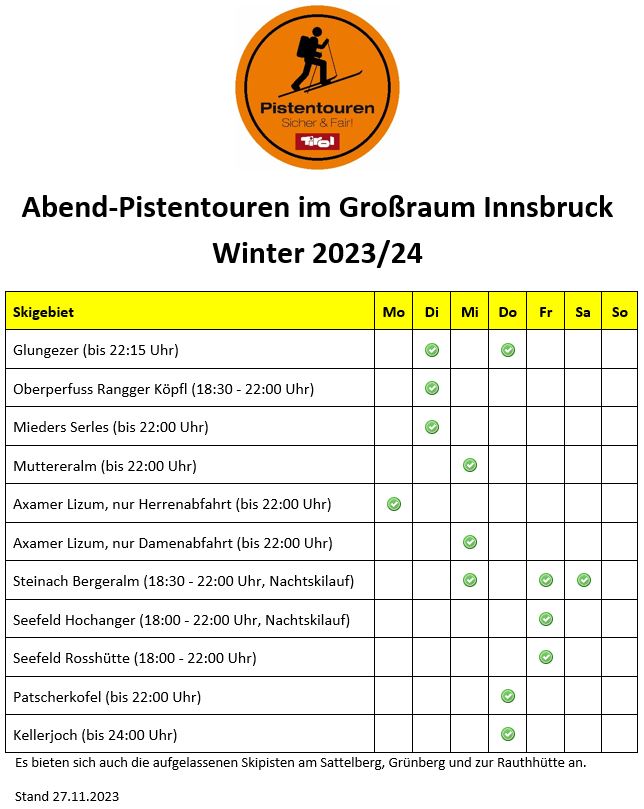 - Pistentourenabende, an denen die Pistenpräparierung für eine sichere Sportausübung erst später am Abend erfolgt