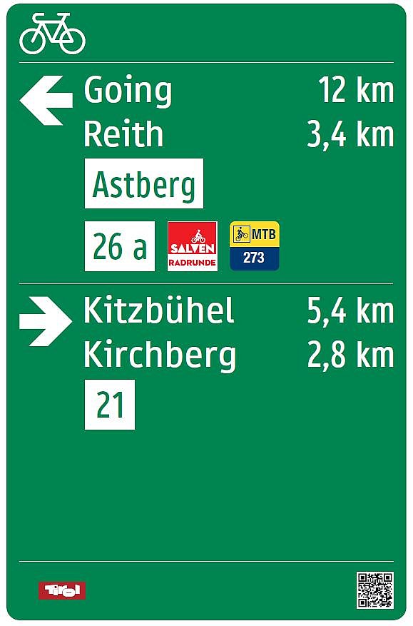 In der Fußzeile der Radwanderwegebeschilderung ist es möglich einen QR-Code zu integrieren, der in der Routing-Anwendung radrouting.tirol direkt auf den jeweiligen Radwanderweg verlinkt. Hier stehen die entsprechenden QR-Codes im Format .png zum Download bereit. Der QR-Code im Format .svg ist auf Anfrage an verkehrsplanung@tirol.gv.at erhältlich: