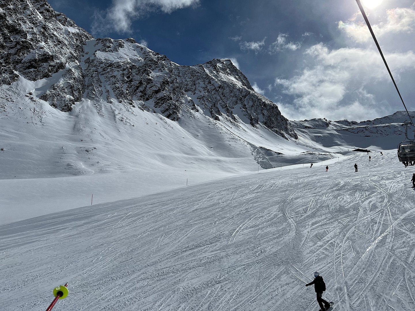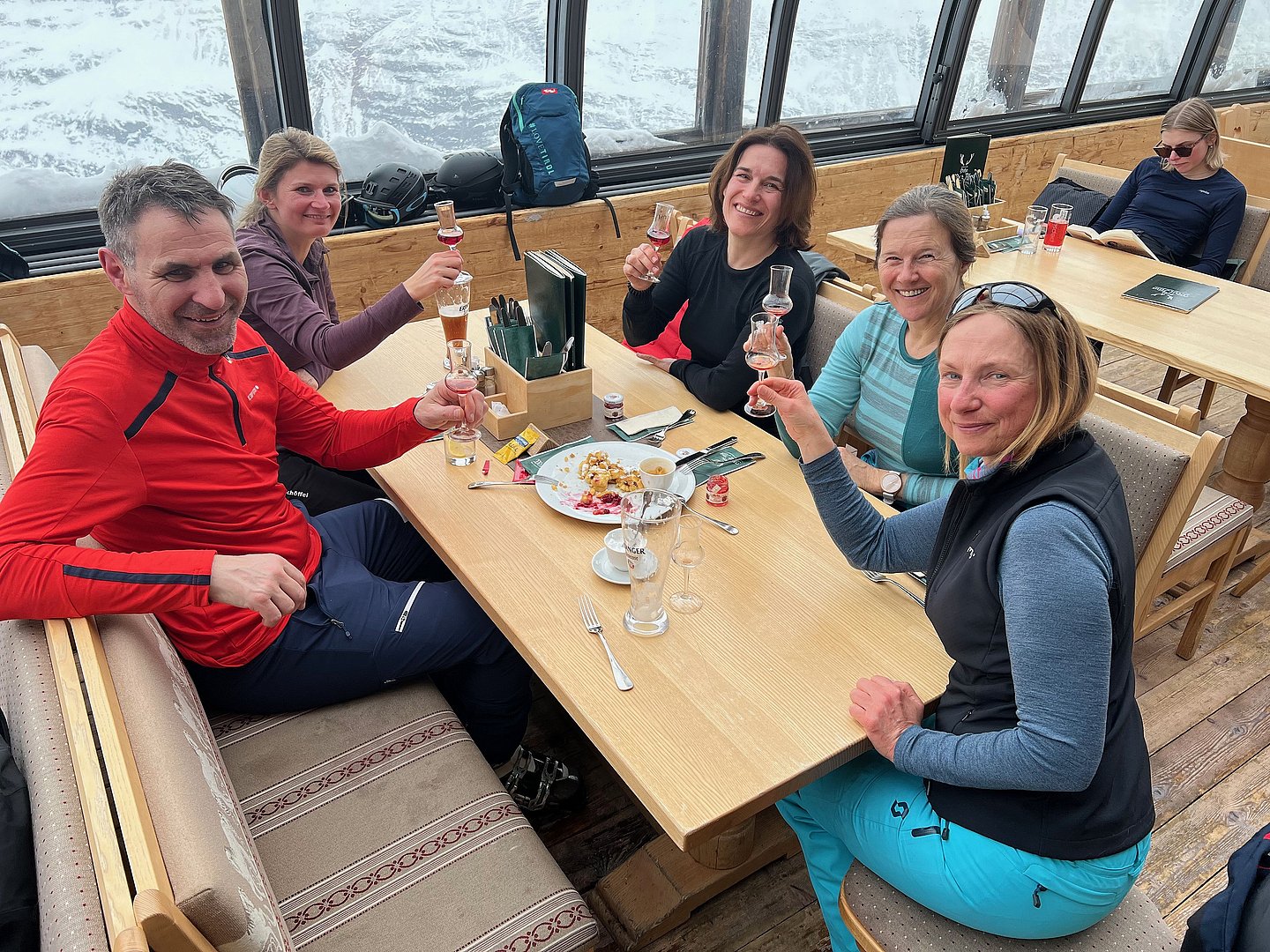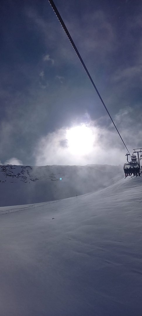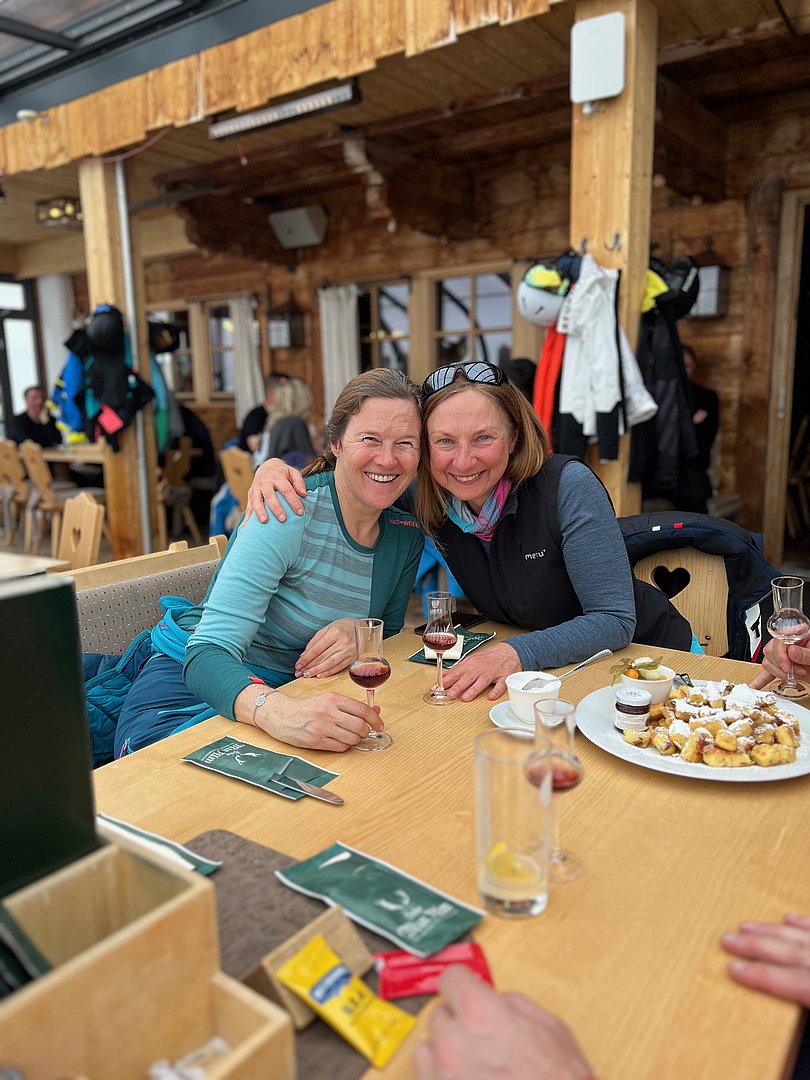 Die frisch präparierten Pisten wurden in der Nacht auf Samstag vom Neuschnee zugedeckt. Dies war von der Gondel aus ein idyllischer Anblick, jedoch unser Fahrkönnen wurde dadurch etwas herausgefordert. Gemeinsam fuhren wir die Pisten ab, machten am späteren Vormittag eine Kaffeepause, bevor es weiter zur Verbindungsbahn "Top-Express" nach Hochgurgl zur Hohen Mut ging. Gestärkt haben wir uns auf der Hohen Mut Alm mit Mittagessen und einem gemeinsamen "Kaiserschmarrn". Zur Unterstützung der Beingeschmeidigkeit für unsere bevorstehende Talabfahrt, spendierte der flotte Kellner uns allen einen "Zirbeler".