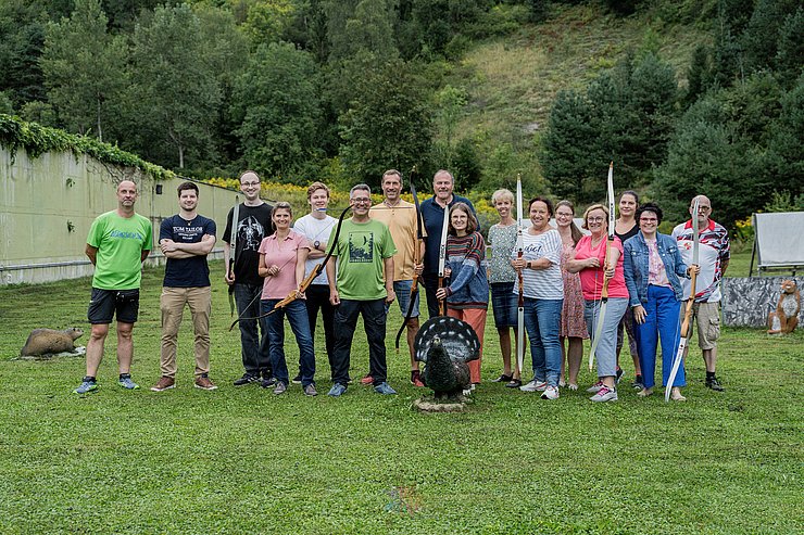 Wieder fanden sich sehr motivierte Mitarbeiter*innen aus verschiedensten Abteilungen zusammen, absolvierten zusammen die Einführung in den Bogensport und durften sich sogleich selbst ans Werk machen. In 2er Gruppen wurde abwechselnd auf die ersten Zielscheiben eingeschossen, um einem zwischendurch eine kleine Pause zu ermöglichen. Manch einer fand dabei schneller in die Mitte, wer etwas Hilfe brauchte, wurde wie letztes Jahr von unseren professionellen Betreuern bestens eingeschult und landete folglich ebenfalls sehr gute Treffer.
