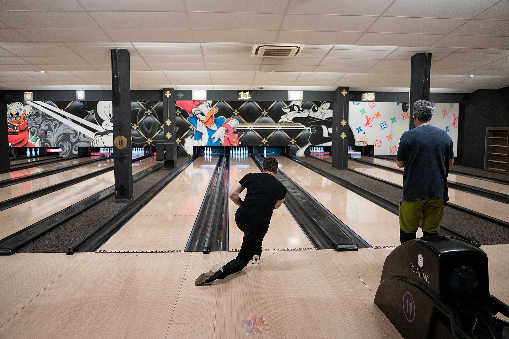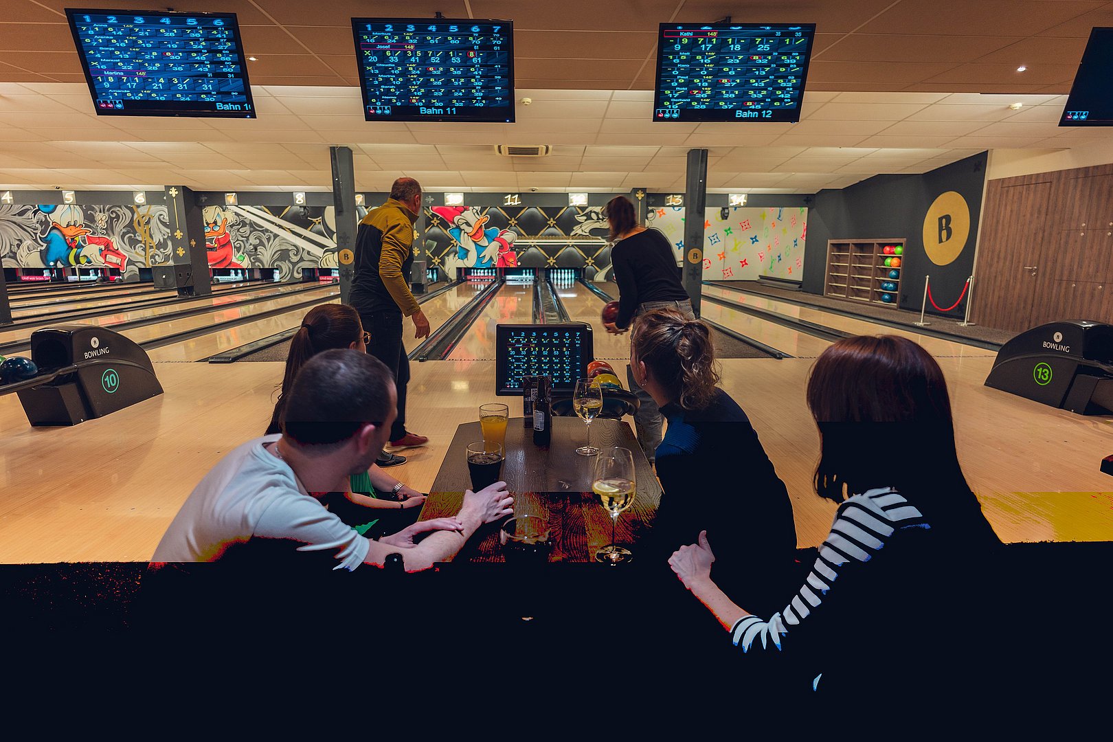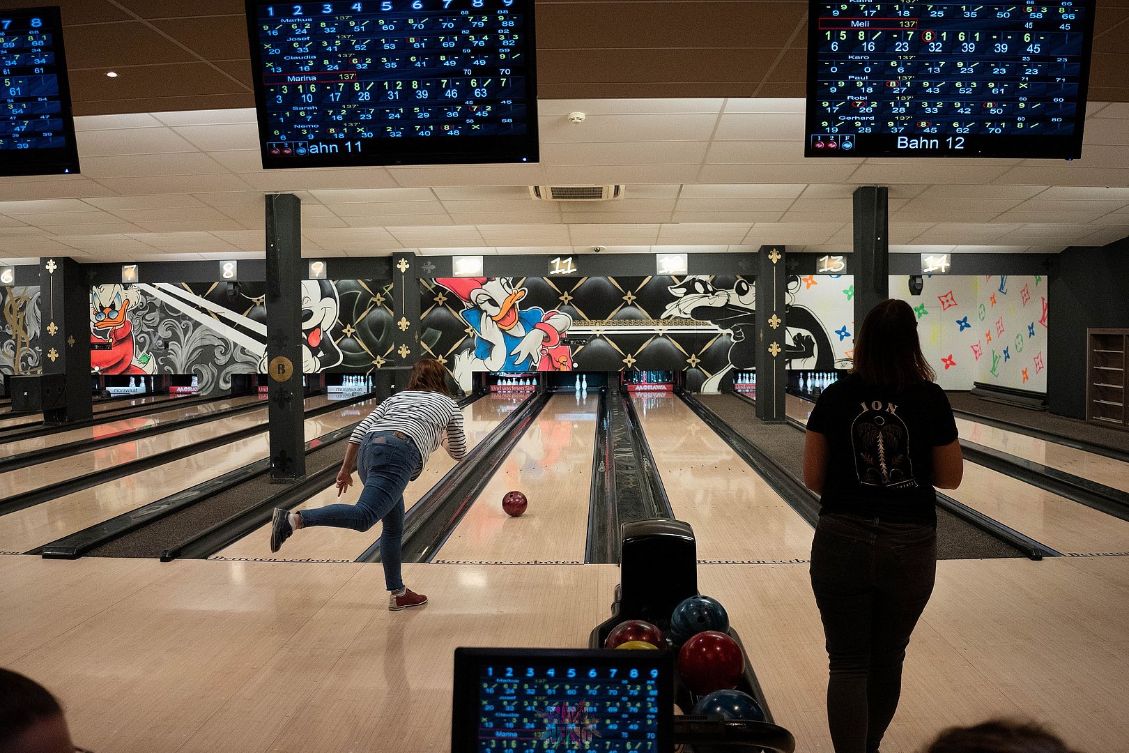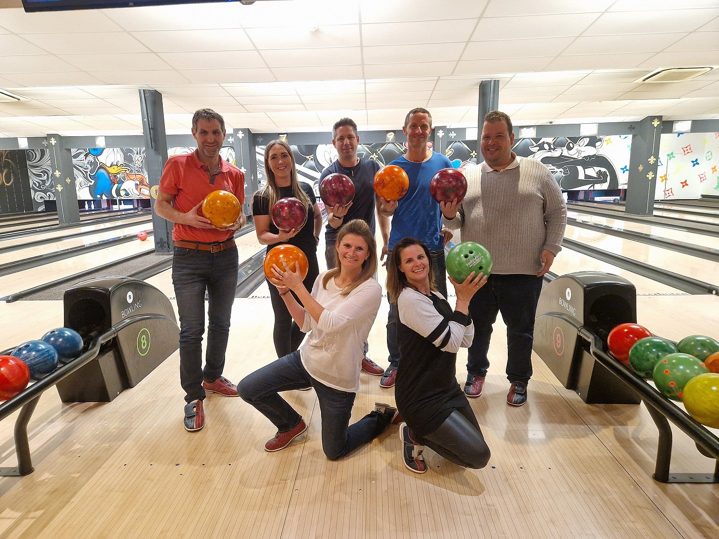 Dann wurden die beiden Teams zur Abwechslung neu gemischt und wir spielten weiter. Zum Ende hin wurde es nochmal lustig: Ein paar von uns hatten die Bowling-Kugeln bis dorthin falsch gehalten - wieder was gelernt ;-)