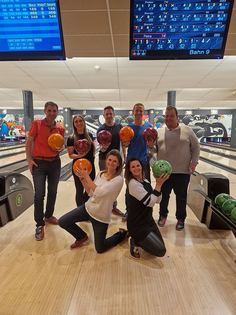 Nachdem wir uns die passenden Schuhe ausgeliehen hatten, hieß es auch schon „lass die Kugel rollen“. Wir teilten uns in drei Teams zu je 6 Personen auf. Die drei Stunden vergingen wie im Fluge. Die Lernkurve ging bei einigen Teilnehmern steil nach oben und es wurden nicht wenige „Strikes“ errollt. Besonders hervorheben möchte ich Paul als den Besten des Abends mit einer Gesamtpunktezahl von 394.