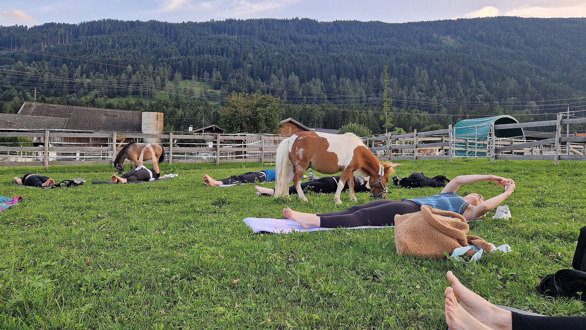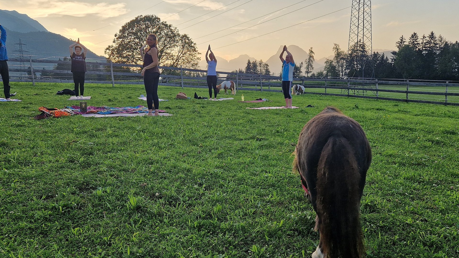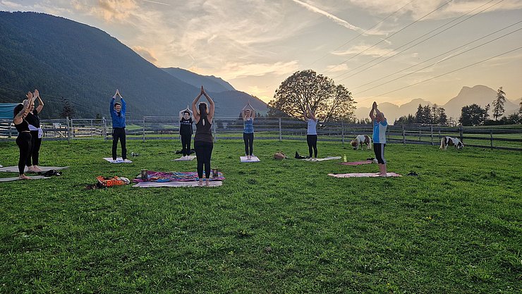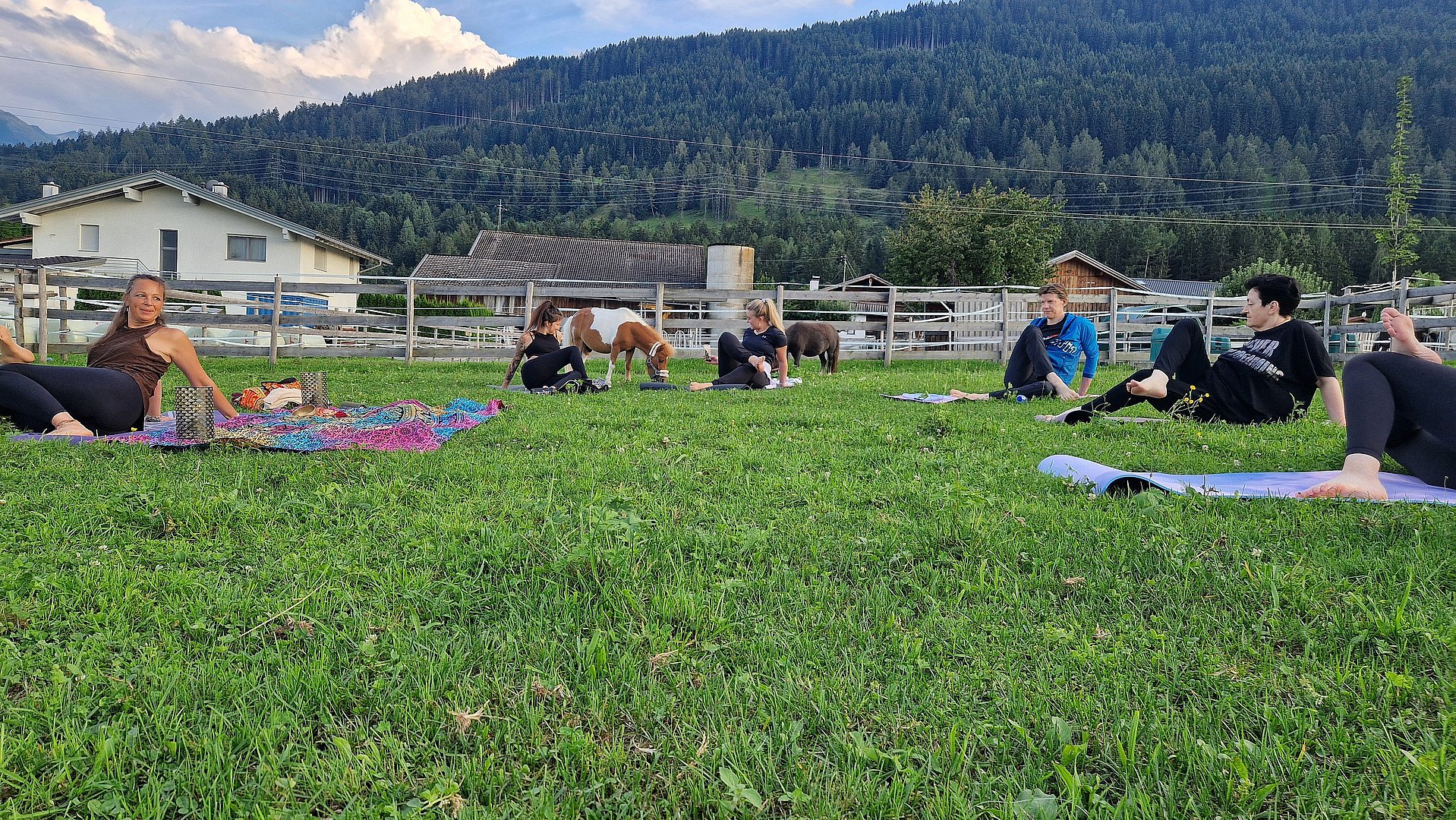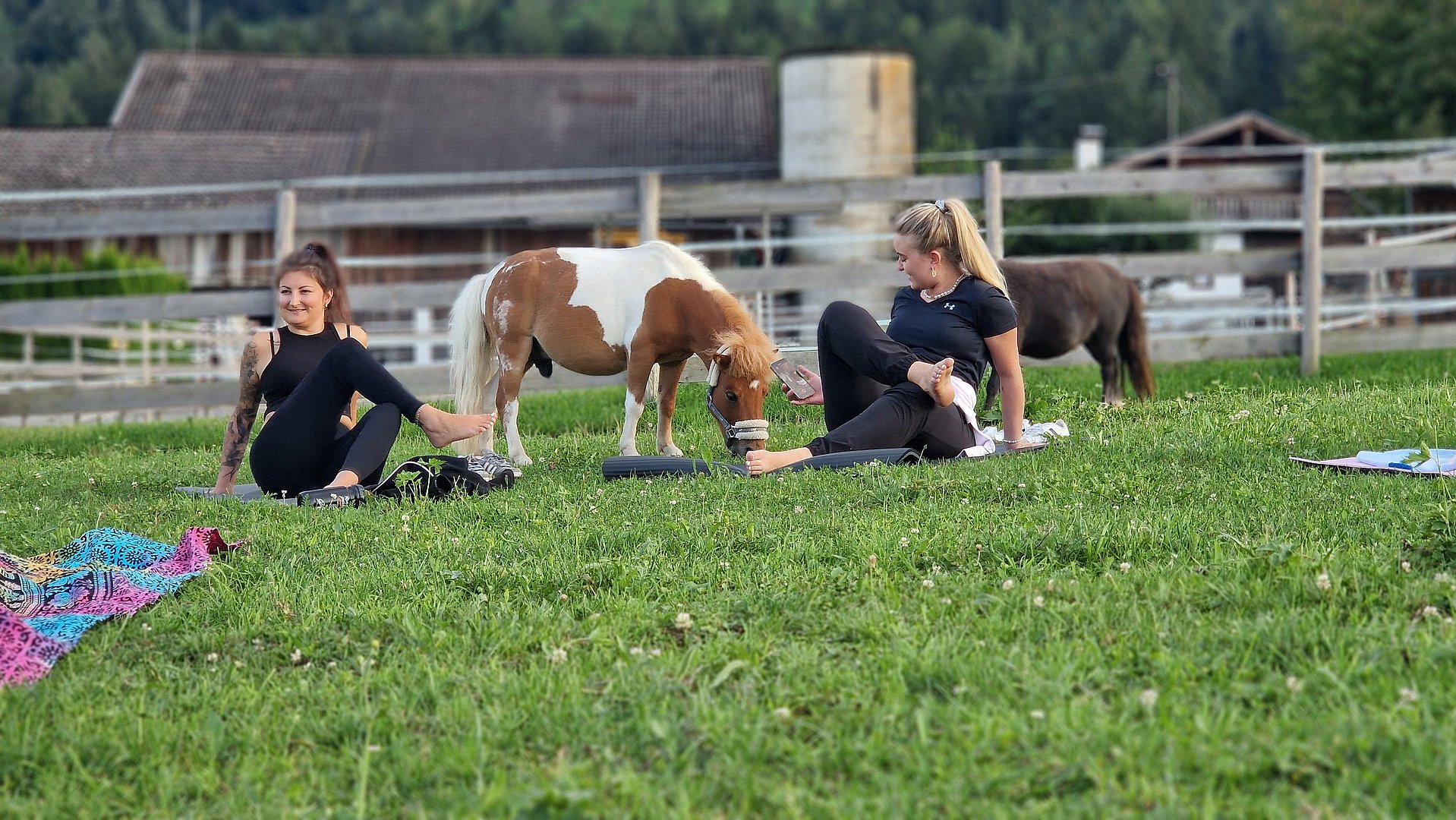 Inmitten einer malerischen Wiese, auf dem idyllischen Veitenhof, grasen die Ponys friedlich daneben. Diese einzigartige Verbindung von Yoga und Ponys schafft eine Atmosphäre der Gelassenheit und Harmonie, die Körper und Geist gleichermaßen erfrischt.