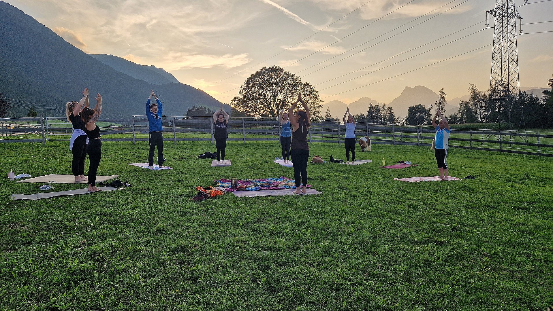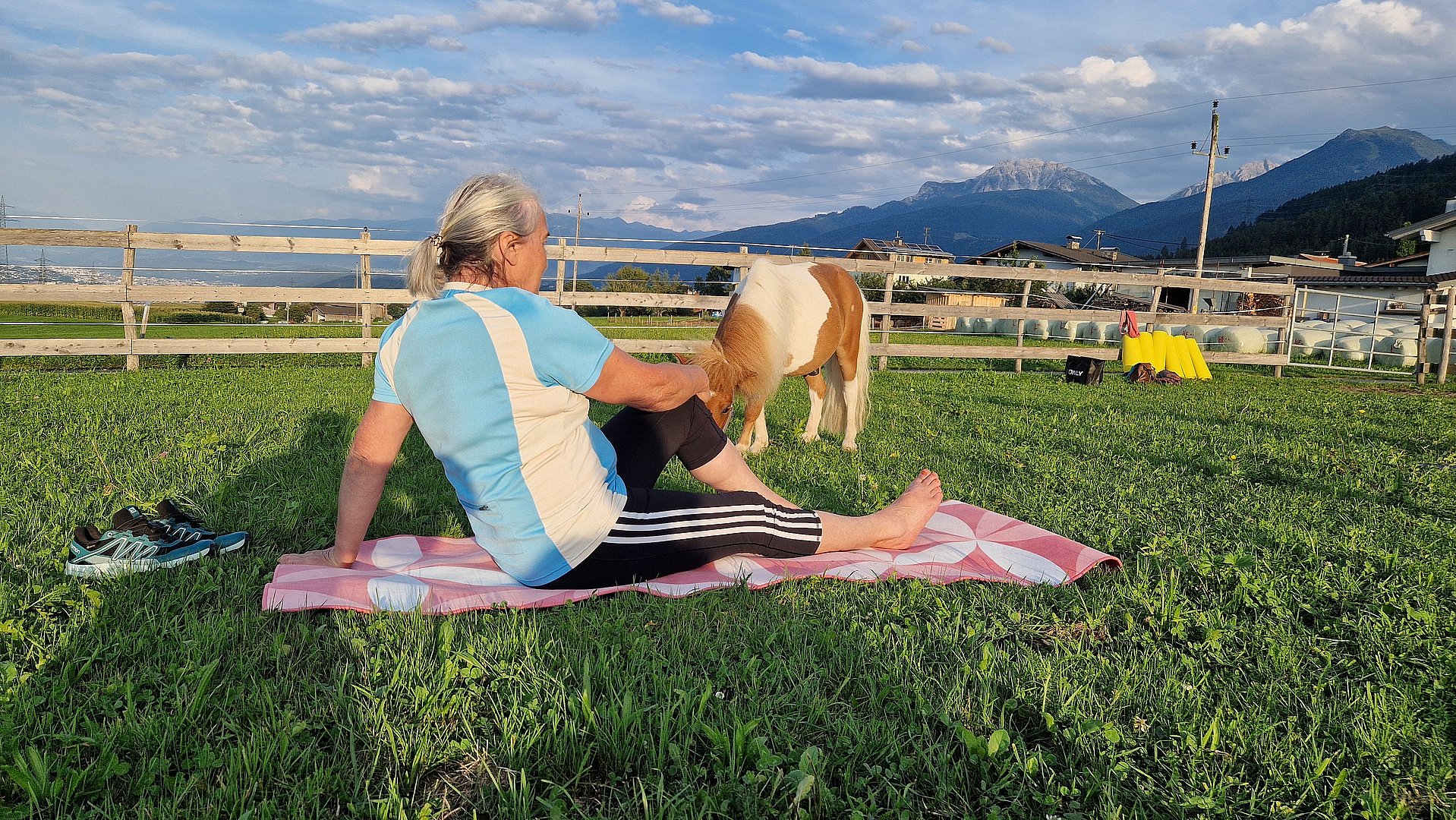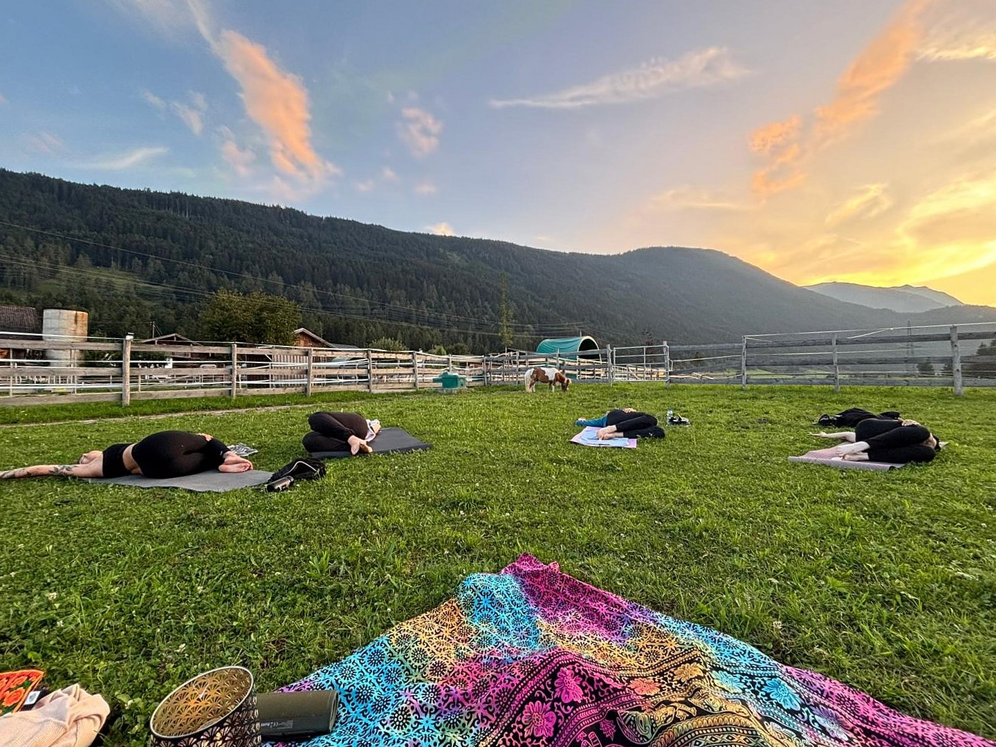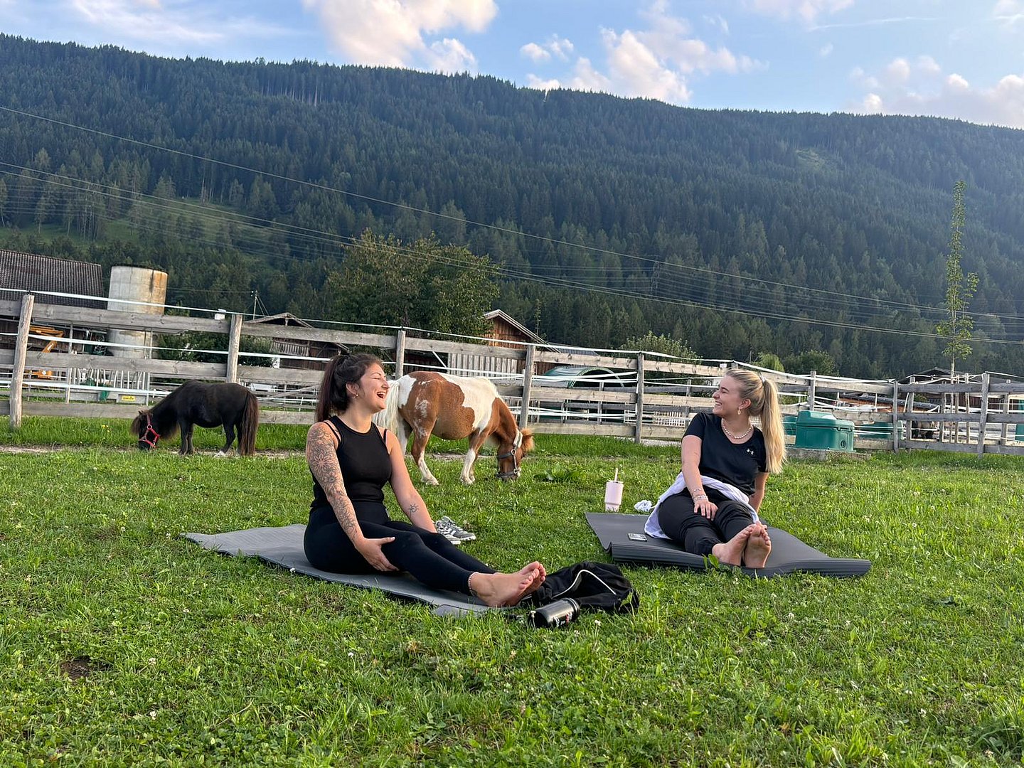 Inmitten einer malerischen Wiese, auf dem idyllischen Veitenhof, grasen die Ponys friedlich daneben. Diese einzigartige Verbindung von Yoga und Ponys schafft eine Atmosphäre der Gelassenheit und Harmonie, die Körper und Geist gleichermaßen erfrischt.