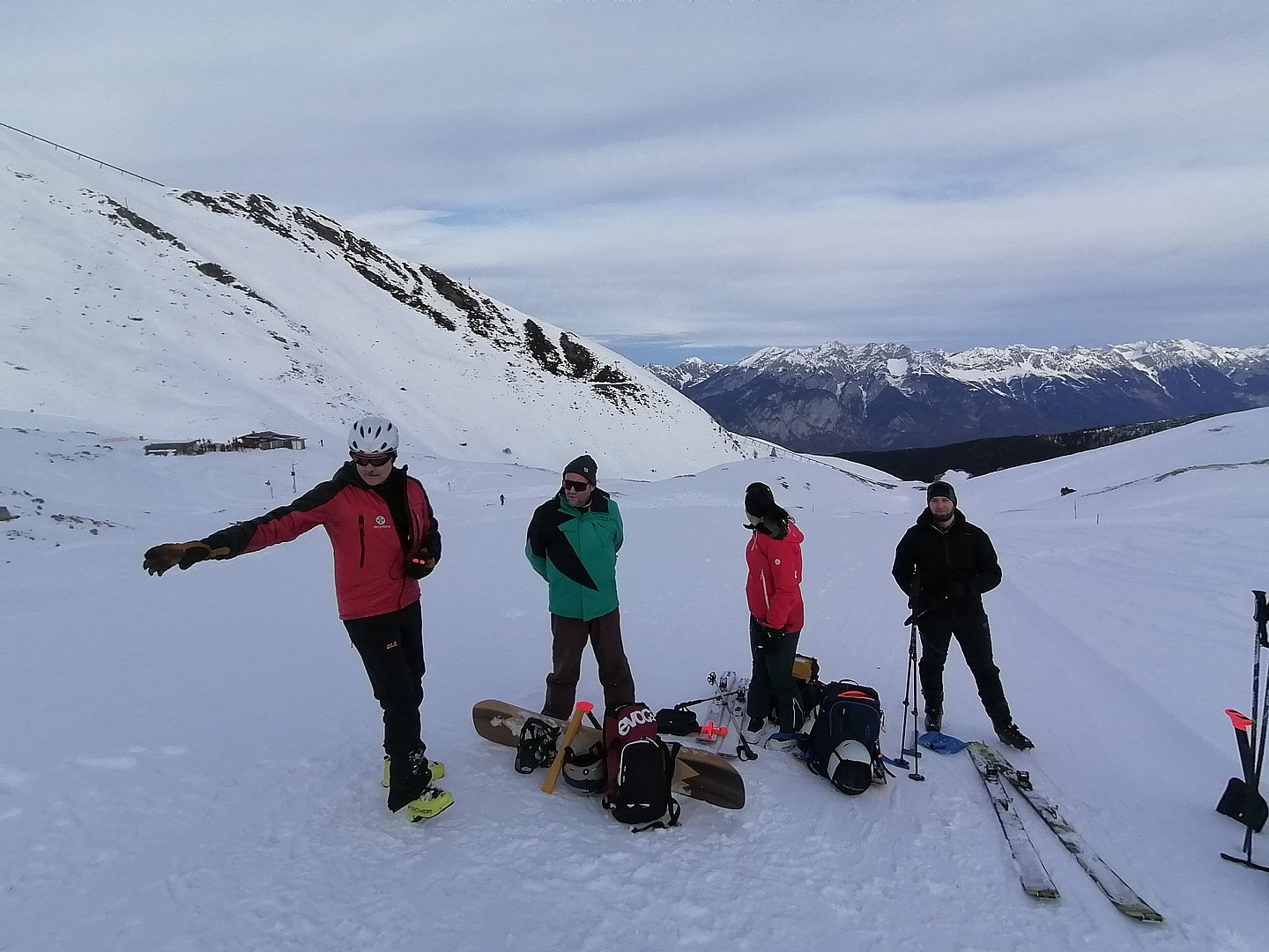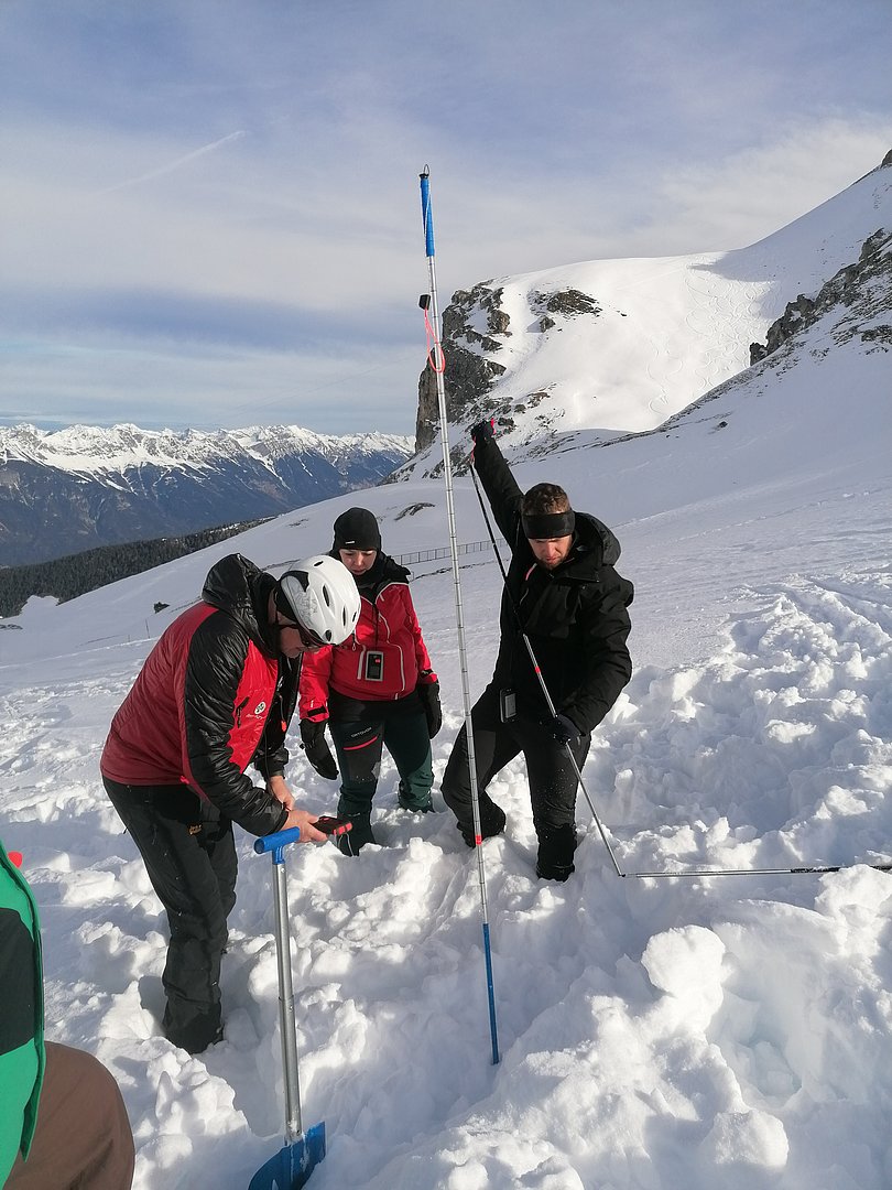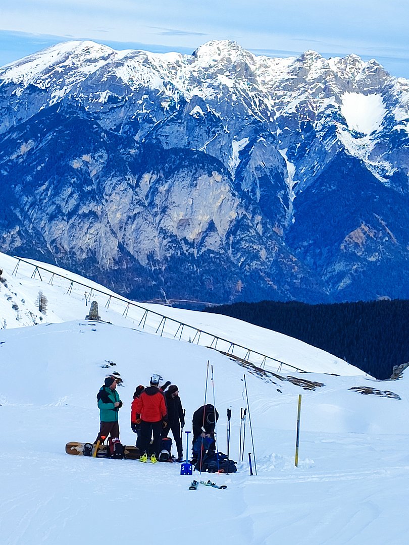 Mit der Bergrettung Axams als Kursleiter und der Bergwelt rund um die Kalkkögel in der Axamer Lizum konnten für den Lawinenkurs mit der Ersten Hilfe Auffrischung die besten Voraussetzungen geschaffen werden. Pünktlich um 8.30 Uhr trafen wir uns (8 Teilnehmer) mit Walter Holzknecht und Clemens Forster von der Bergrettung Axams bei der Talstation der Axamer Lizum, von wo aus wir uns mit den Tourenski Richtung Dohlennest auf den Weg machten. Hinter dem Dohlennest in der Nähe des Speichersees fanden wir ein optimales Gelände für den Lawinen- und Erste Hilfe Auffrischungskurs vor. Die Teilnehmer wurden in zwei Gruppen geteilt. Die eine Gruppe bekam vom Walter wichtige Informationen über Schneeprofile und über das richtige Verhalten und der Handhabung des LVS-Gerätes bei der Verschüttetensuche. Im Anschluss wurde eine Verschüttetensuche simuliert, indem ein Rucksack vergraben wurde. Jeder konnte die Suche mit dem LVS-Gerät üben. Es stellte sich dabei heraus, dass das Orten eines Verschütteten, das richtige Schaufeln und das Sondieren zum einen sehr kräfteraubend ist und zum anderen auch geübt sein muss. Das Bergen und die Erstversorgung war der zweite Teil des Kurses, wo uns Clemens über die Maßnahmen der Erstversorgung unterrichtete und uns u.a. auch die vielseitige Funktion der Rettungsdecke und der Israeli Bandage demonstrierte.