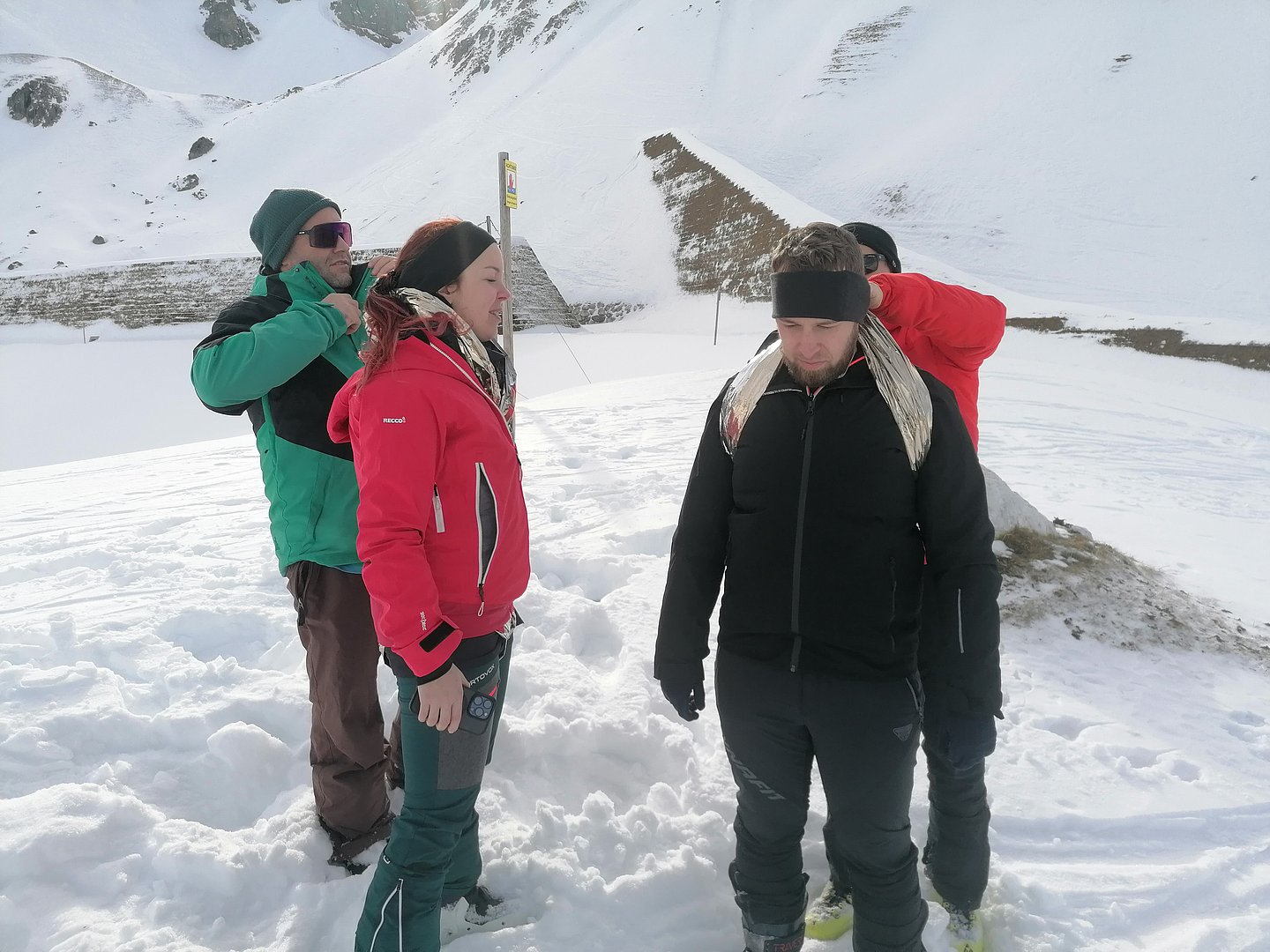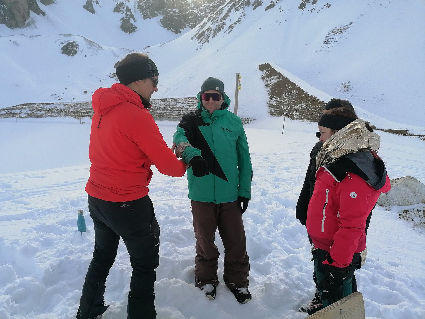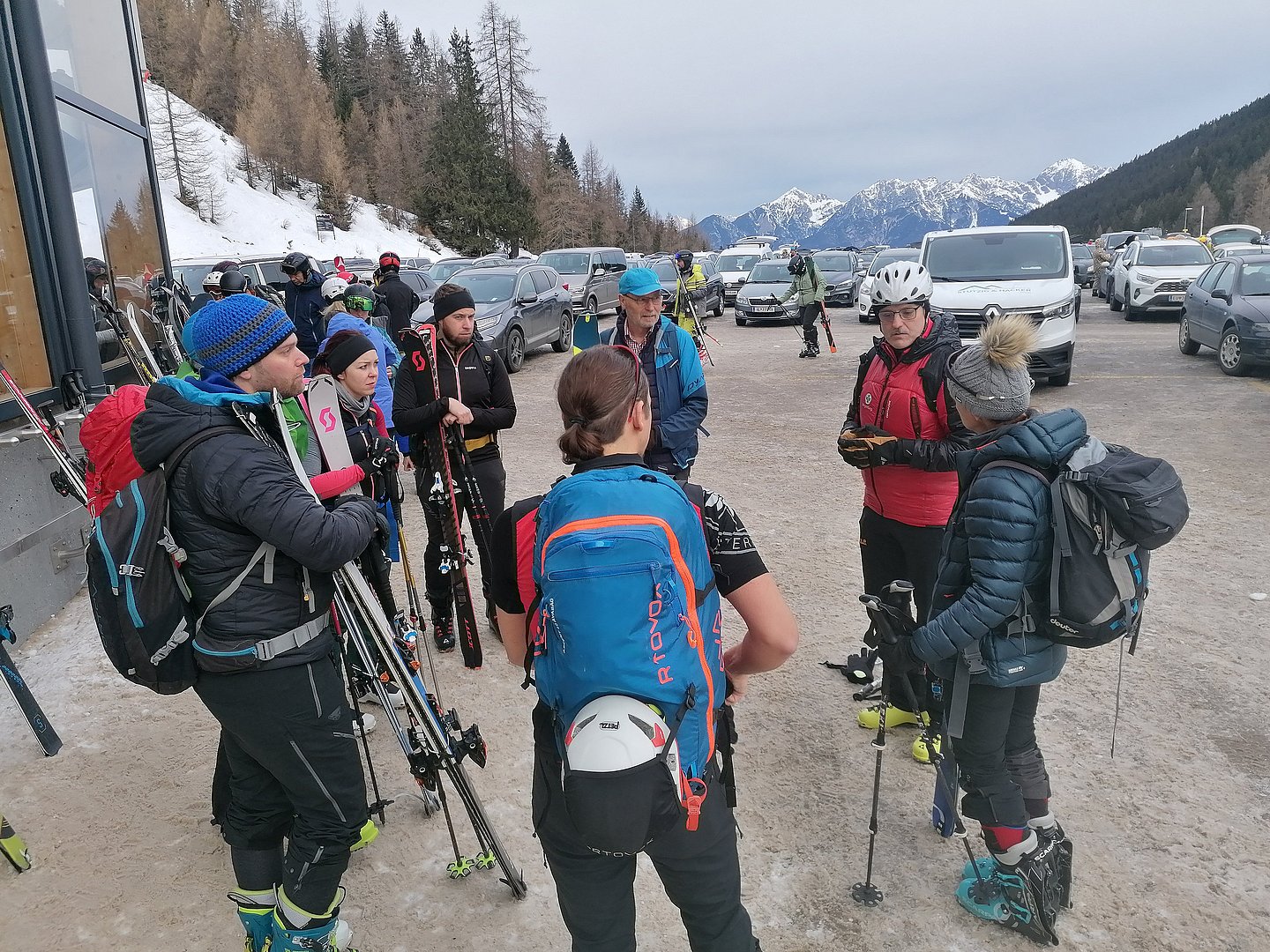 Mit der Bergrettung Axams als Kursleiter und der Bergwelt rund um die Kalkkögel in der Axamer Lizum konnten für den Lawinenkurs mit der Ersten Hilfe Auffrischung die besten Voraussetzungen geschaffen werden. Pünktlich um 8.30 Uhr trafen wir uns (8 Teilnehmer) mit Walter Holzknecht und Clemens Forster von der Bergrettung Axams bei der Talstation der Axamer Lizum, von wo aus wir uns mit den Tourenski Richtung Dohlennest auf den Weg machten. Hinter dem Dohlennest in der Nähe des Speichersees fanden wir ein optimales Gelände für den Lawinen- und Erste Hilfe Auffrischungskurs vor. Die Teilnehmer wurden in zwei Gruppen geteilt. Die eine Gruppe bekam vom Walter wichtige Informationen über Schneeprofile und über das richtige Verhalten und der Handhabung des LVS-Gerätes bei der Verschüttetensuche. Im Anschluss wurde eine Verschüttetensuche simuliert, indem ein Rucksack vergraben wurde. Jeder konnte die Suche mit dem LVS-Gerät üben. Es stellte sich dabei heraus, dass das Orten eines Verschütteten, das richtige Schaufeln und das Sondieren zum einen sehr kräfteraubend ist und zum anderen auch geübt sein muss. Das Bergen und die Erstversorgung war der zweite Teil des Kurses, wo uns Clemens über die Maßnahmen der Erstversorgung unterrichtete und uns u.a. auch die vielseitige Funktion der Rettungsdecke und der Israeli Bandage demonstrierte.