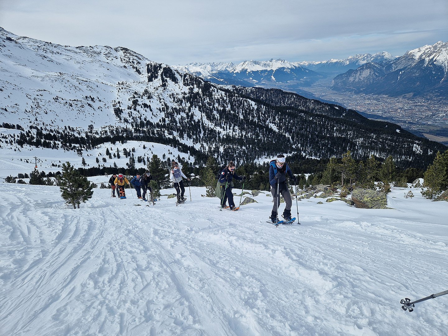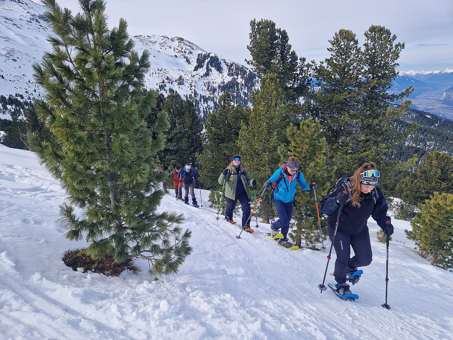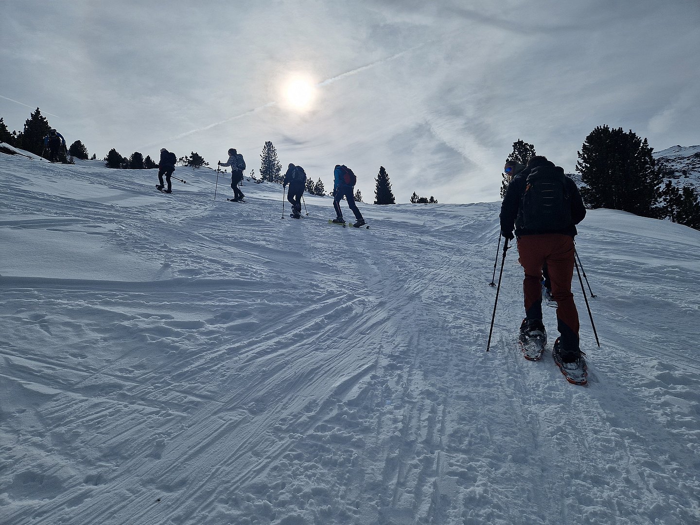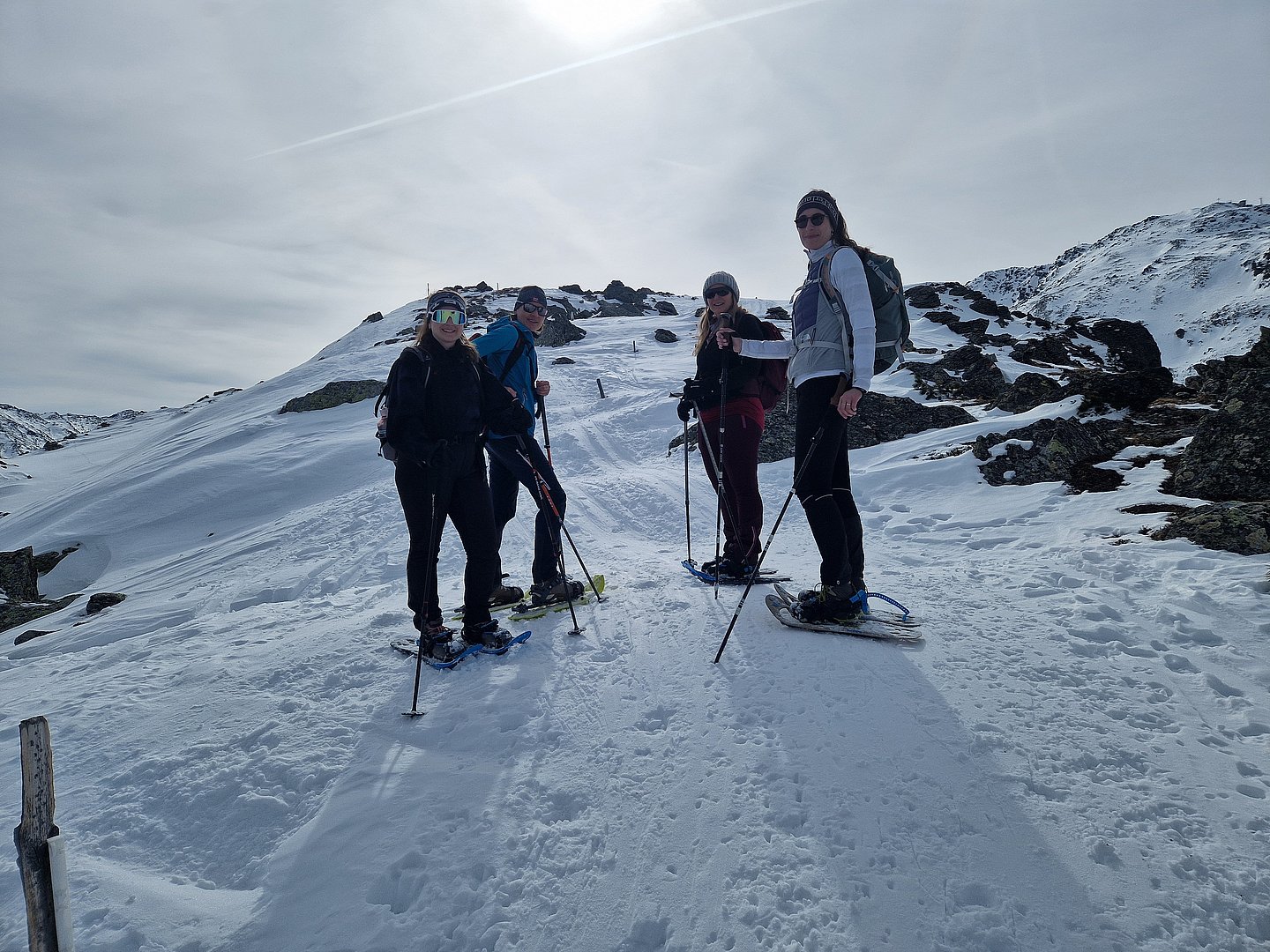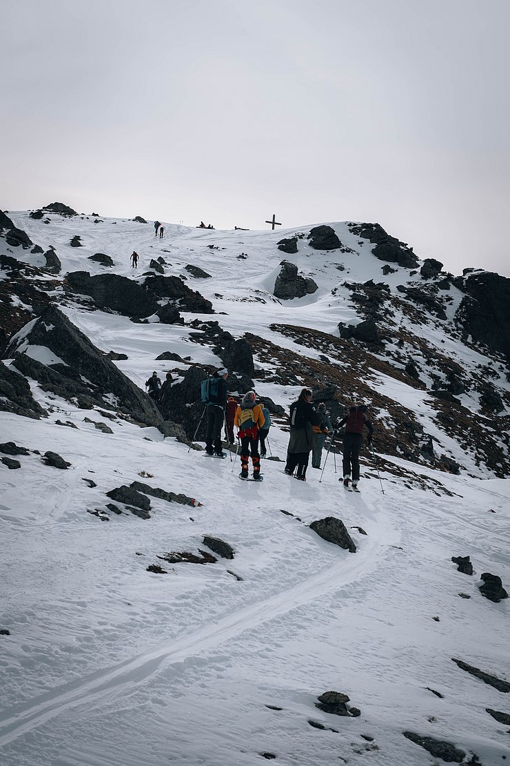 Nach Ankunft bei der Bergstation Tulfein bekamen wir eine kurze Einweisung und schnallten sogleich die Schneeschuhe an. Das Wetter war mit teils sonnigen, teils diesigen Bedingungen genau richtig für die Wanderung. Der erste steile, etwas abschüssige, aber kurze Abschnitt stellte eine kleine Bewährungsprobe dar, doch wir meisterten diese Herausforderung und wurden mit flacheren, wunderschönen und ruhigen Abschnitten abseits der Massen belohnt.