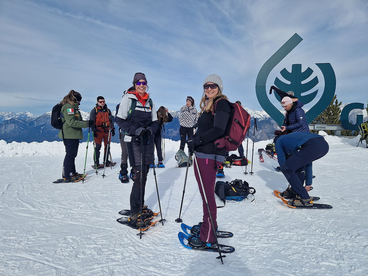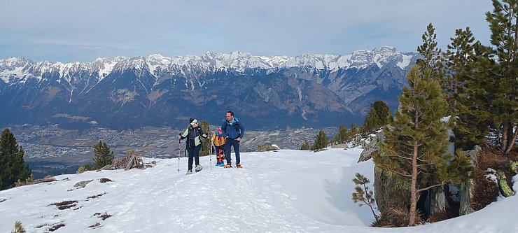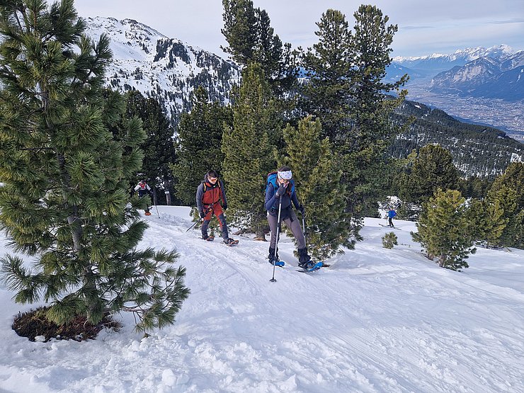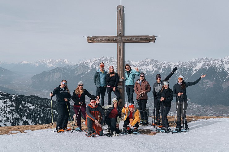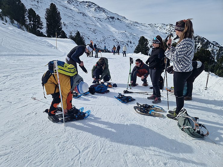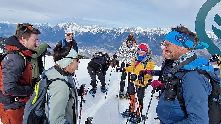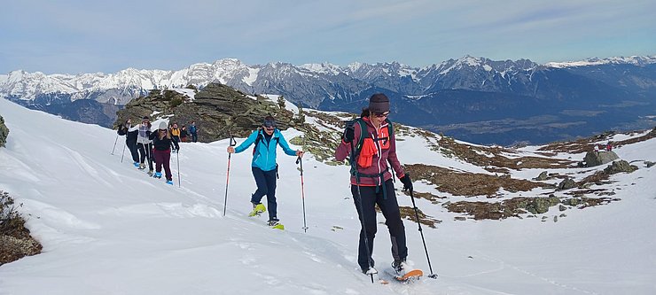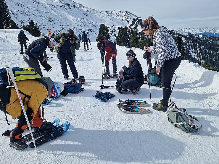 Zehn Mitglieder der Sportvereinigung versammelten sich am Samstag, den 22. Februar, um 9:30 Uhr an der Talstation der Glungezer Bahn. Da einige der Teilnehmer*innen einmal das Schneeschuhwandern ausprobieren wollten, wurden gleich 7 Paar Leih-Schneeschuhe verteilt.