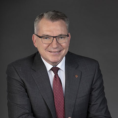 Portraitfoto von LHStv Geisler im Gang stehend mit dunklem Anzug