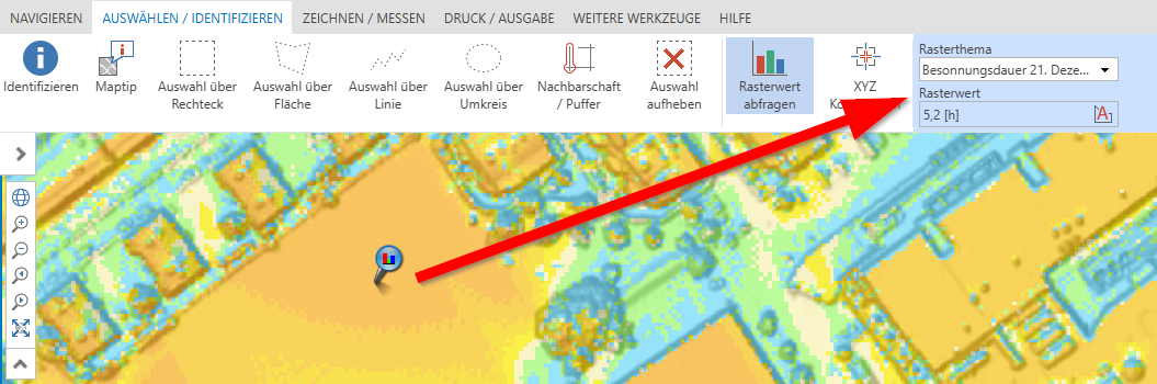 Darüber hinaus haben Sie die Möglichkeit, die maximale Sonnenscheindauer pro Tag in Stunden an einem bestimmten Punkt direkt in tirisMaps abzufragen. Im Menü AUSWÄHLEN / IDENTIFIZIEREN wählen Sie das Werkzeug ‘Rasterwert abfragen’ sowie das Rasterthema Besonnungsdauer des gewünschten Quartals. Per Mausklick an den gewünschten Punkt in der Karte wird Ihnen nun ein Rasterwert wiedergegeben, der die maximale Sonnenscheindauer in Stunden an diesem Punkt angibt.