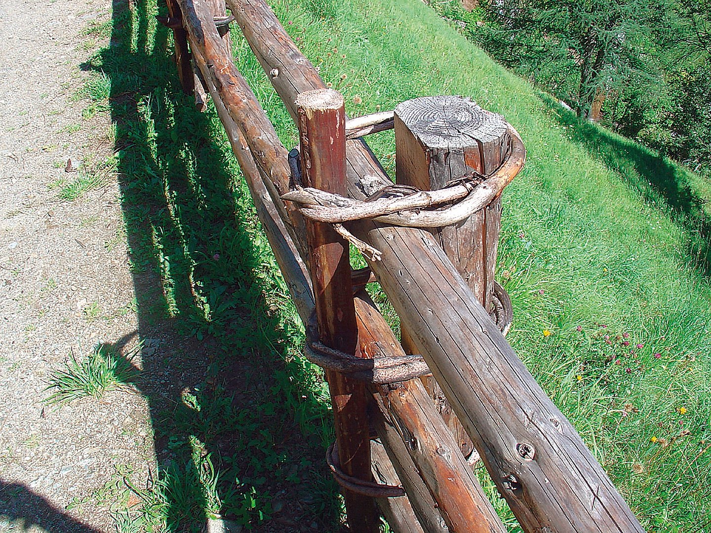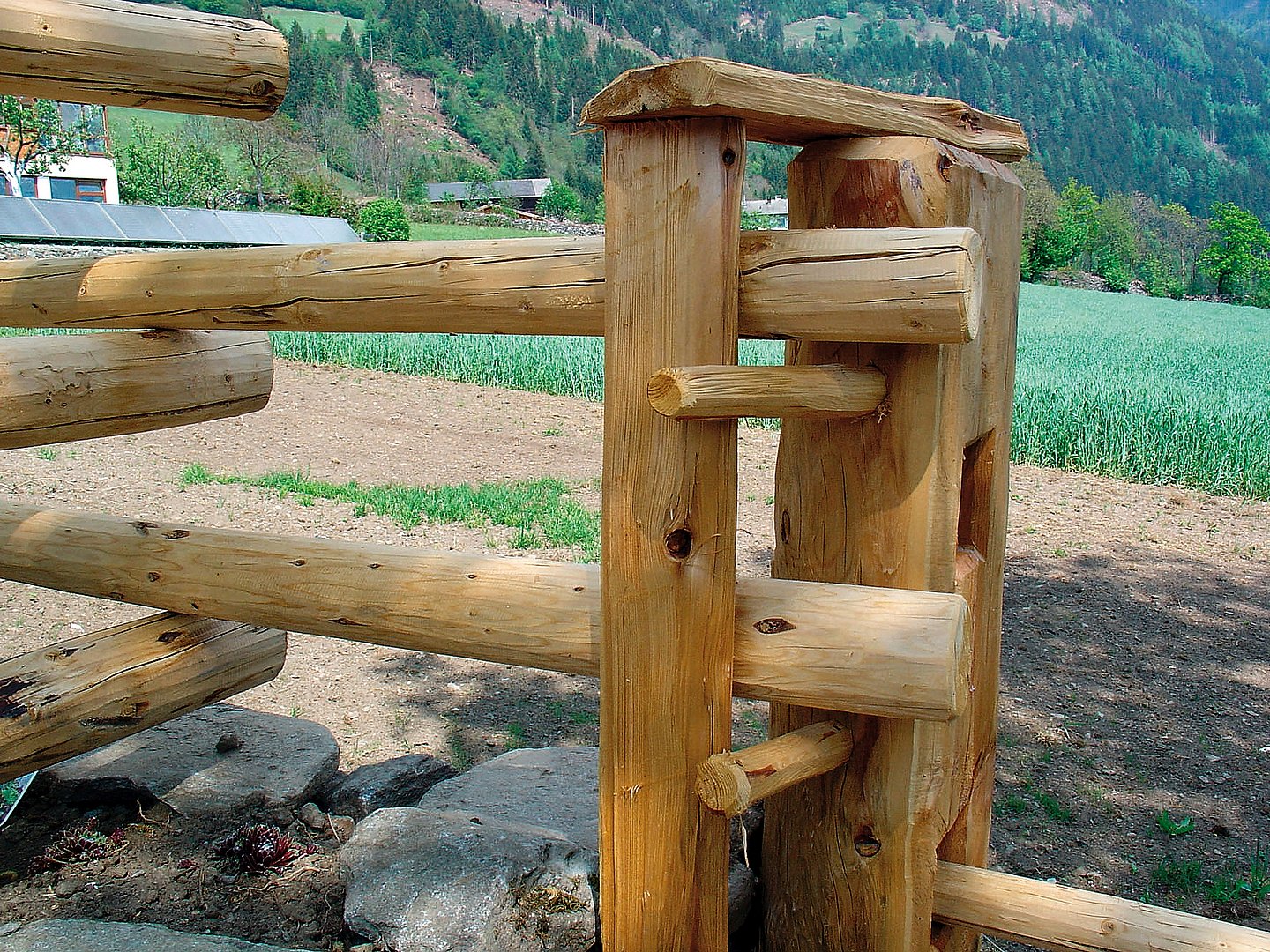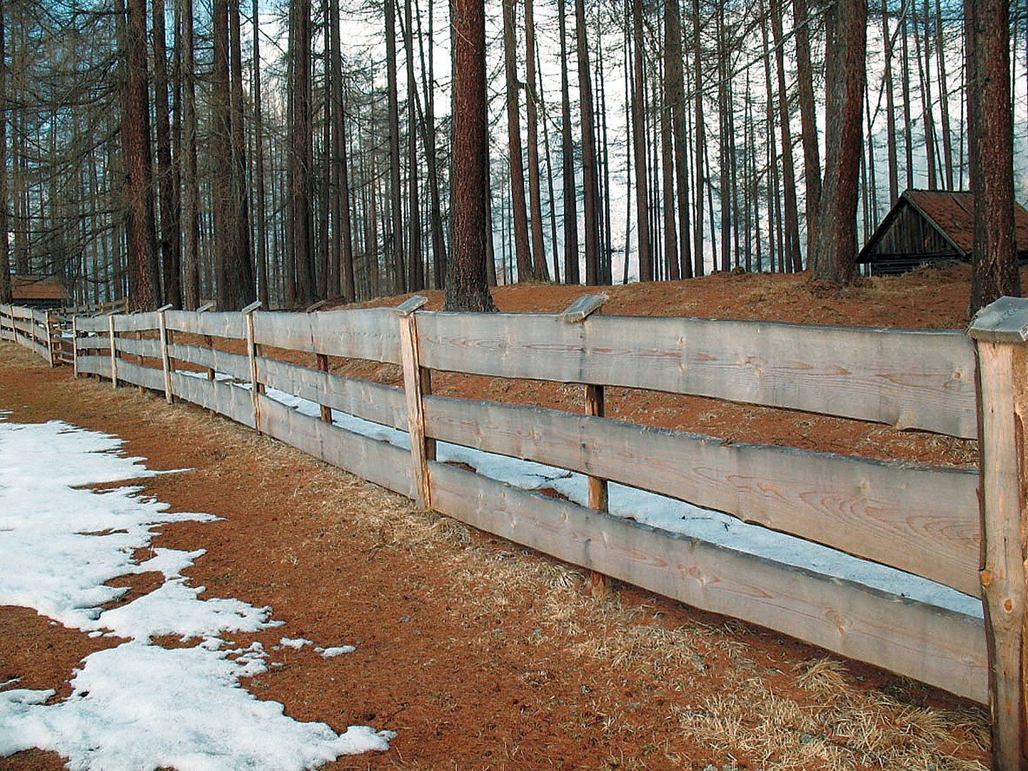 - Variante 2: Speltenzaun, genagelt: Die ca. 1,80 m langen, ungeschnittenen Zaunstecken oder -säulen werden in einem Abstand von 2-4 m ungefähr 40-60 cm tief in den Boden geschlagen. Etwa 25-30 cm über dem Boden wird waagrecht eine 4-6 m lange runde oder gespaltene (nicht geschnittene) Stange (Bodenstange) aufgenagelt. Eine zweite Querlatte wird auf Dreiviertelhöhe des Zaunpfostens befestigt. Die Spelten haben eine Stärke von 5-15 cm und werden durch Spaltung von Lärchenstämmen oder aus Stangen hergestellt (keine geschnittenen Spelten!). Die Spelten werden am oberen Ende zugespitzt und anschließend an die beiden Querstangen angenagelt. Die Höhe des Zaunes beträgt 130-160 cm.