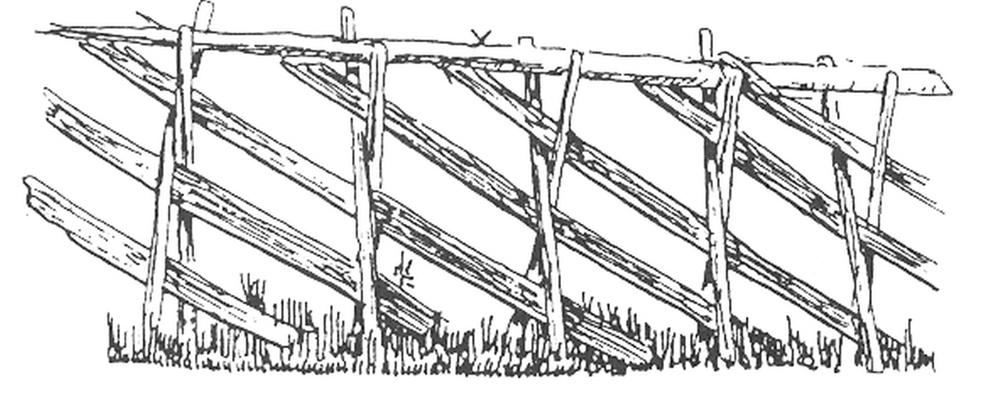- Kreuzzaun: 3-6 Steckenpaare werden schräg in den Boden geschlagen, sodass sich jeweils 3-6 Kreuzungspunkte bilden. Auf diese Kreuzungspunkte (Scheren), die von oben nach unten ca. 30-50 cm Abstand aufweisen, werden 3-6 Stangen gelegt. Die Steckenpaare weisen einen Abstand von ca. 4-5m auf.Der Kreuzzaun ist auch auf steilem Gelände leicht zu errichten, da die Stangen jeweils auf einen nächsthöheren Kreuzungspunkt gelegt werden können und demnach fast waagrecht zu liegen kommen. Wenn die Steckenpaare tief genug in den Boden gerammt werden, ist der Kreuzzaun ein langhaltender Zaun.