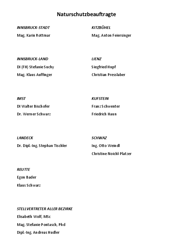 Die im Landhaus angelobten Naturschutzbeauftragten haben in den kommenden fünf Jahren die Aufgabe, den Landesumweltanwalt in den Bezirken zu unterstützen, um die Interessen der Natur zu vertreten. Sie nehmen vor der Bezirksverwaltungsbehörde die Parteistellung für den Landesumweltanwalt wahr, indem sie beispielsweise an mündlichen Verhandlungen teilnehmen und Ortsaugenscheine durchführen. Die fünf Frauen und 13 Männer wurden mit Beschluss der Tiroler Landesregierung bestellt und von der zuständigen Naturschutzlandesrätin LHStvinIngrid Felipe angelobt: „Unsere Naturschutzbeauftragten sind AnwältInnen der Natur. Es freut mich, dass sich auch für die kommende Funktionsperiode Menschen gemeldet haben, die mit Herz und Verstand für die Erhaltung unserer Naturschätze eintreten. Sie sind in den Bezirken auch Ansprechpersonen für die Bevölkerung bei naturschutzrelevanten Fragestellungen.“