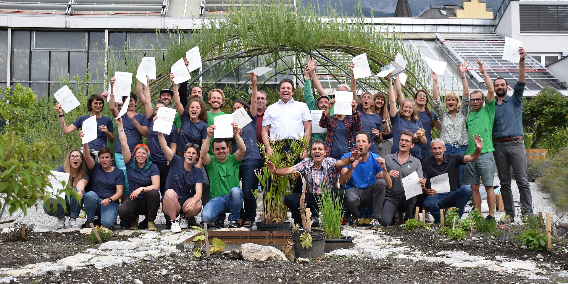 Welche Wildkräuter am Wegesrand zu entdecken sind, wie die Singdrossel klingt oder welche Gesteinsarten eine Landschaft prägen – die Lebensräume Wald, Wasser, Wiese und Gebirge kennen die 30 neuen NaturführerInnen in Tirol wie ihre Westentasche: Sie absolvierten zwischen April und Juni die insgesamt 16-tägige Ausbildung samt Abschlussprüfung und Abschlussarbeit und lernten ihr Handwerk von führenden ExpertInnen in Naturkunde, Biologie, Didaktik und Kommunikation. Besonderer Fokus der vom Verein Natopia angebotenen Ausbildung liegt auf der Arbeit in der Praxis – die verschiedenen Lebensräume wurden in den Tiroler Naturparks und im Nationalpark Hohe Tauern erkundet. Vor Kurzem wurde den frischgebackenen NaturführerInnen des heurigen Lehrgangs das offizielle NaturführerInnen-Zertifikat von Naturschutzlandesrat René Zumtobel und den Kursleitern Wolfgang Bacher und Daniel Baumgartner vom Verein Natopia im Botanischen Garten der Universität Innsbruck verliehen.