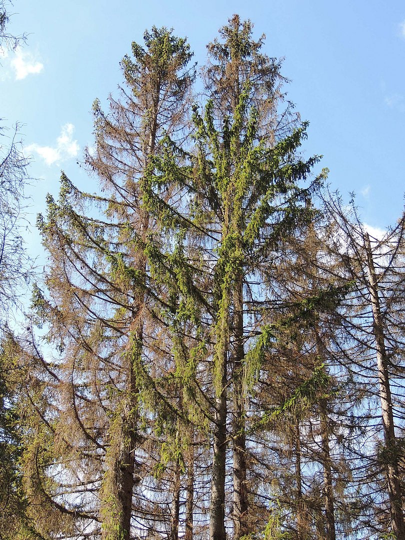 Eine gelbe bis rotbraune Kronenverfärbung, die vom Kronenansatz zur Spitze verläuft, deutet auf Buchdruckerbefall hin. Bei Trockenstress würde sich die Krone rotbraun von oben nach unten verfärben. Die Fichtenkrone verfärbt meist erst in einem späten Befallsstadium. Oft sind die Käfer bereits ausgeflogen. Dann ist es wichtig, in der näheren Umgebung nach frischen Befallskennzeichen zu suchen.