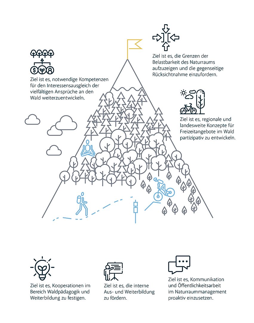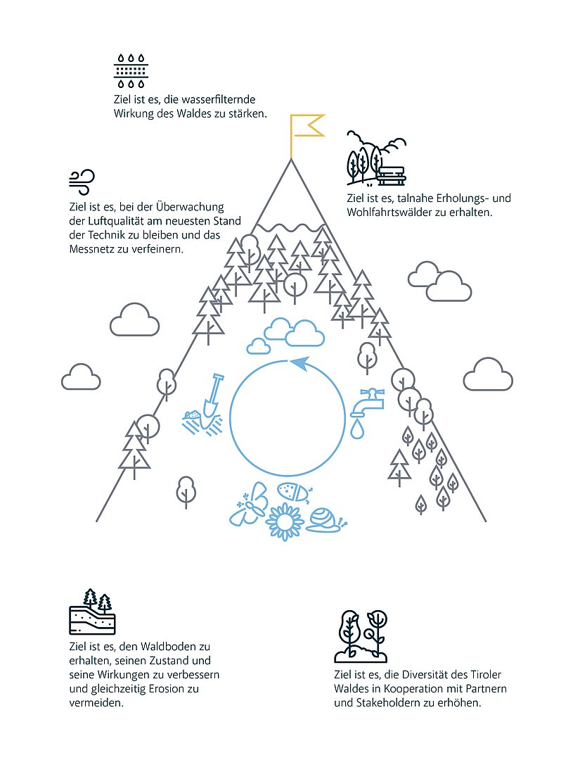 Der Landesforstdienst wickelt Förderungen zu den Themen Waldbewirtschaftung sowie Projekten im Erholungsraum ab. In der forstlichen Bewirtschaftung richtet sich der Fokus auf die Schwerpunkte Anpassung an den Klimawandel und Stärkung der Waldfunktionen, insbesondere der für Tirol gesellschaftlich unverzichtbaren Schutzfunktion der heimischen Wälder. Regional ist die rasche und gezielte Wiederherstellung von gesunden und vitalen Wäldern nach Katastrophen ganz entscheidend. Im Erholungsraum geht es um ein gutes Miteinander und den Respekt sowie Ausgleich zwischen den verschiedenen Interessensgruppen. Bei all den positiven Aspekten um die zunehmende Nutzung des Waldes als Erholungsraum wird seitens des Landesforstdienstes darauf geachtet, dass die Bewirtschaftung der Wälder und die Wertigkeit als Lebensraum für heimische Tier- und Pflanzenarten nachhaltig gegeben ist. Über Projekte und Initiativen wie „Bergwelt Tirol – Miteinander Erleben“ wird ein Ausgleich über eine wirksame Bewusstseinsbildung und Besucherlenkung im Naturraum vorangetrieben.