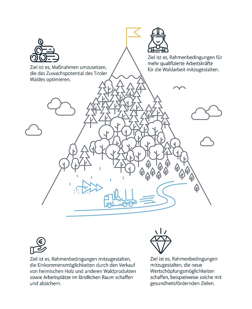 Die Tiroler Waldwirtschaft arbeitet seit vielen Jahrzehnten nachhaltig und naturnah. Es wird maximal der jährliche Zuwachs, der an den Jahresringen den Bäume erkennbar ist, genutzt. Das sind rund 1,5 bis 1,8 Mio m3 Holz, die aus dem Tiroler Wald kommen. Rund 30.000 WaldbesitzerInnen und Nutzungsberechtigte bewirtschaften den Tiroler Wald, der 42% der Landesfläche bedeckt. Auf Grund der topografischen Gegebenheiten gibt es nur wenige reine Wirtschaftswälder (26%) und auch nur beschränkte Möglichkeiten zur Mechanisierung und Rationalisierung. Waldwirtschaft im Gebirge ist daher aufwendig und teuer und muss immer auch die anderen Funktionen des Waldes (Schutz- Wohlfahrts und Erholungsfunktion) mitberücksichtigten. Das Forstgesetzt und die Tiroler Waldordnung spannen einen strengen Rahmen für die Nutzung unserer Wälder. So ist beispielsweise eine Großteil der Holznutzungen vom Waldaufseher oder Förster fachkundig auszuzeigen. Generell herrscht nach jeder Nutzung die Pflicht zur Wiederbewaldung/Aufforstung innerhalb von zehn Jahren.