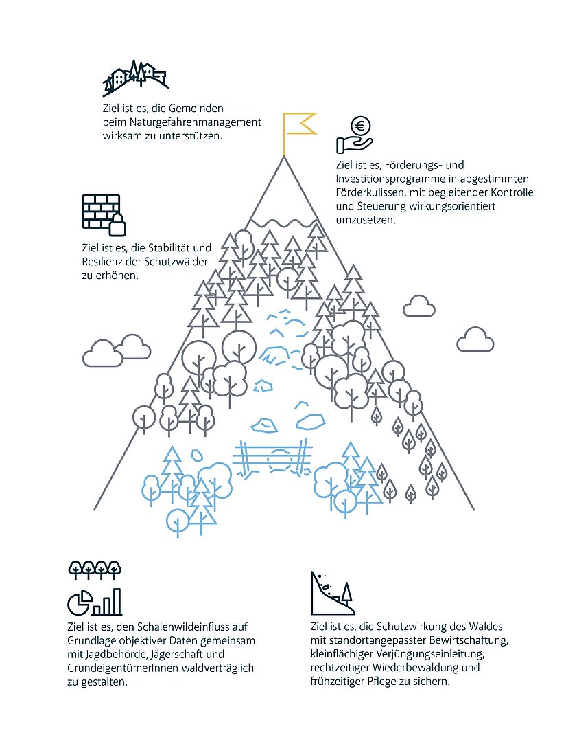 In den letzten Jahren haben großflächige Schadereignisse durch Wind und Schneebruch stark zugenommen. Der Alpenraum ist besonders vom rasanten Temperaturanstieg betroffen und muss mit zunehmenden Wetterextremen rechnen. Eine wirkungsorientierte nachhaltige Schutzwaldbewirtschaftung, wo notwendig auch in Kombination mit technischen Maßnahmen, steht dabei im Mittelpunkt des integralen Ansatzes beim Schutz vor Naturgefahren. Das heißt in der Praxis, dass die teilweise überalten und instabilen Schutzwälder durch kleinflächige Nutzungseingriffe verjüngt und gepflegt werden müssen. Besonderes Augenmerk ist auf die pflegliche Nutzung mittels Seilkrantechnik und die Baumartenwahl für die Wiederbewaldung zu legen. Die anschließende Pflege und Strukturierung der jungen Waldbestände erfordert viel Arbeitseinsatz und Zeit. Eine ausreichende Erschließung mit Forststrassen erleichtert die Schutzwaldarbeit bzw. macht diese oftmals erst möglich.