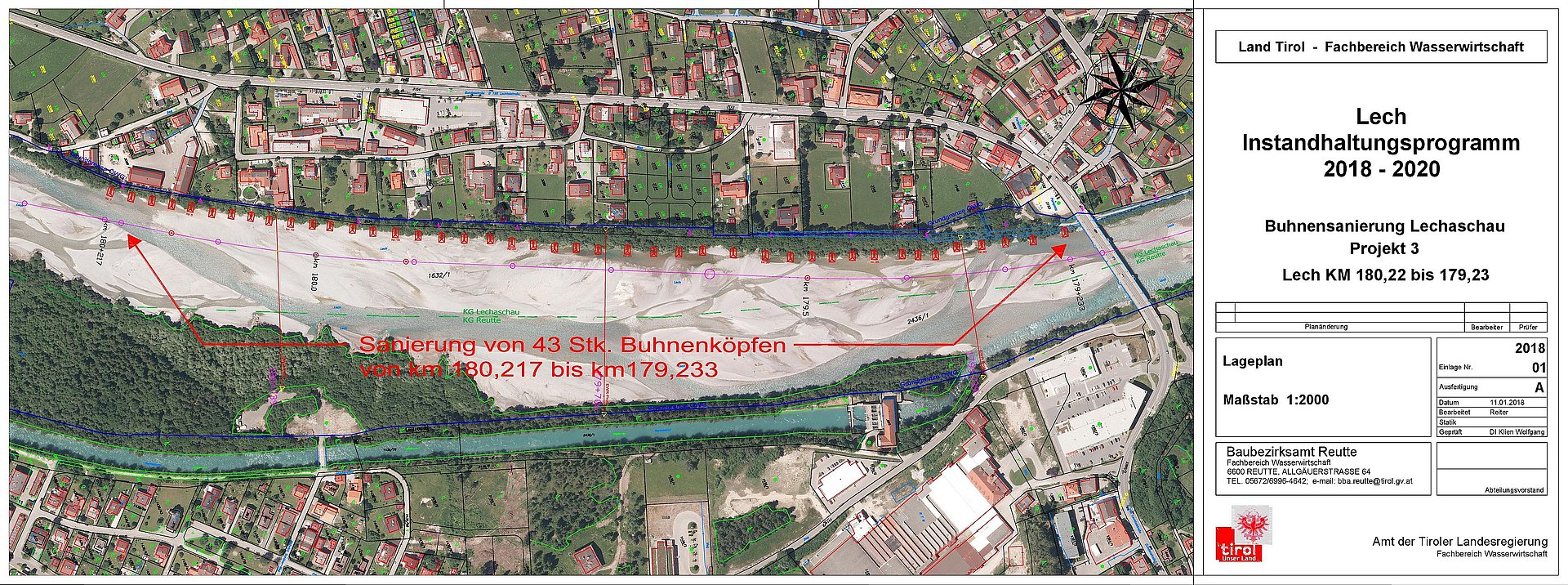 Im Gemeindegebiet Lechaschau (Bereich Lech-km 180,22 bis 179,23) wurde in den Jahren 1986, 1987 und 1989 43 Stück Buhnen zur Sicherung des Hochwasserdamms eingebaut. Nach etlichen großen und kleinen Hochwässern sind die Buhnen sehr in Mitleidenschaft gezogen worden. Teilweise sind nur noch Reste der Buhnen zu sehen bzw. sind auf die Hälfte ihrer ursprünglichen Größe „geschrumpft“. Im Zuge der Erhaltung werden am linken Ufer (ca. 1.000 m Länge) die bestehenden Buhnenköpfe aus den 80er Jahren wieder saniert. Teilweise werden nur die Buhnenköpfe neu ausgebildet sodass die Länge wieder ca. 7 m beträgt und teilweise müssen die Buhen komplett neu aufgebaut werden.