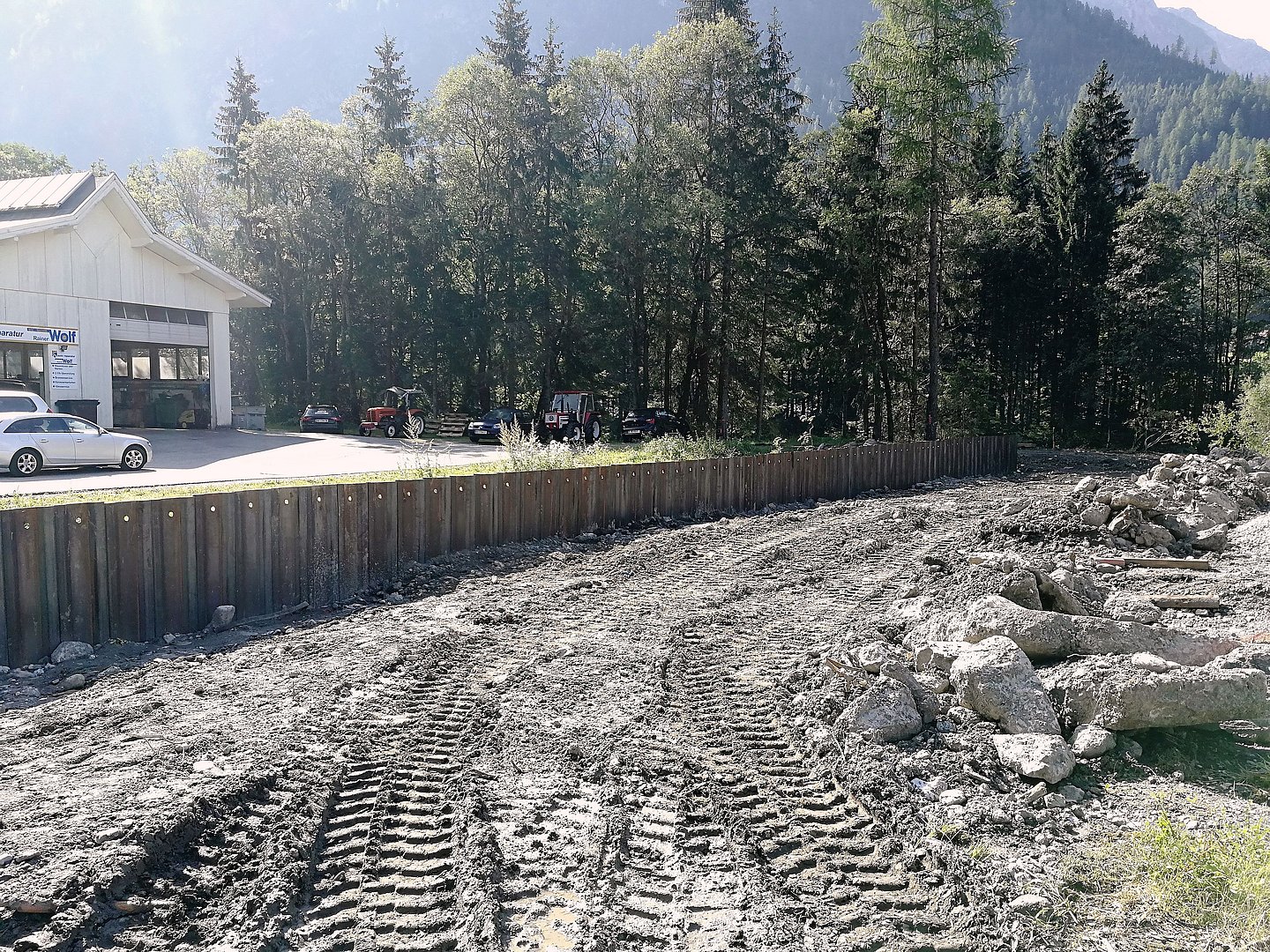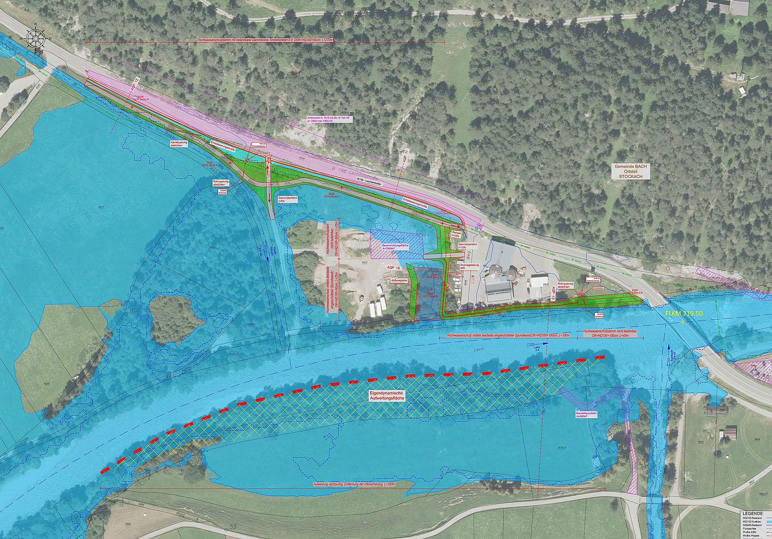 Bei den Hochwasserereignissen der Jahren 1999 und 2005 trat der Lech in diesem Bereich über sein Flussbett hinaus und überschwemmte einen Teil der angrenzenden Flächen. Zum Schutz des Siedlungsgebietes, des Gewerbegebietes Wolf und der Lechtal-Bundesstraße werden nun die notwendigen schutzwasserbautechnischen Maßnahmen durchgeführt. Oberhalb der Stockacher Lechbrücke, zwischen dem Hotel Schönauer Hof und dem Gewerbegebiet Wolf, wird ein ca. 400m langer Hochwasserdamm aufgeschüttet.
