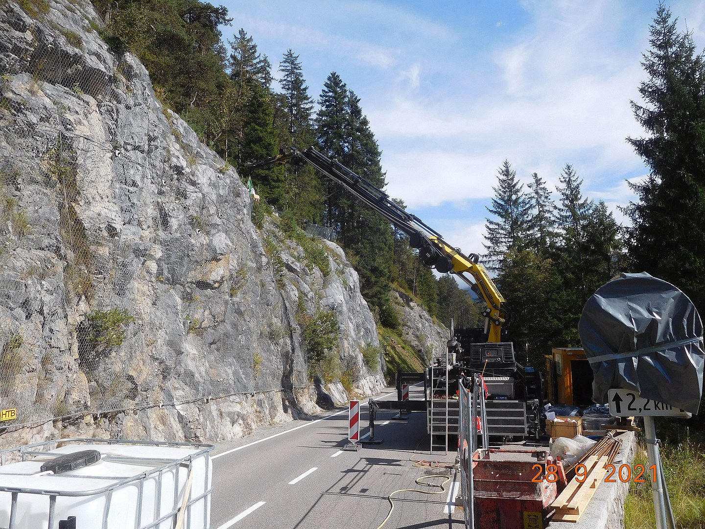 Bei einem Steinschlagereignis Ende 2020 wurden bereits bestehende Steinschlagschutzeinrichtungen im Bereich des „Gaichtpasses“ oberhalb der B 199 Tannheimer Straße auf Höhe Straßenkilometer 3,0 beschädigt. Die Begutachtung durch die Landesgeologie ergab, dass für eine größtmögliche Sicherheit der VerkehrsteilnehmerInnen, nebst Reparatur, eine größere Wirkhöhe der Steinschlagschutzzäune erforderlich ist. Daher werden nunmehr die bestehenden Einrichtungen abgetragen und mit größerer Ausführungshöhe neu errichtet sowie Anschlussbereiche ergänzend mit Schutzeinrichtungen ausgestattet. Insgesamt werden ca. 90 Laufmeter Steinschlagschutzzäune neu errichtet.