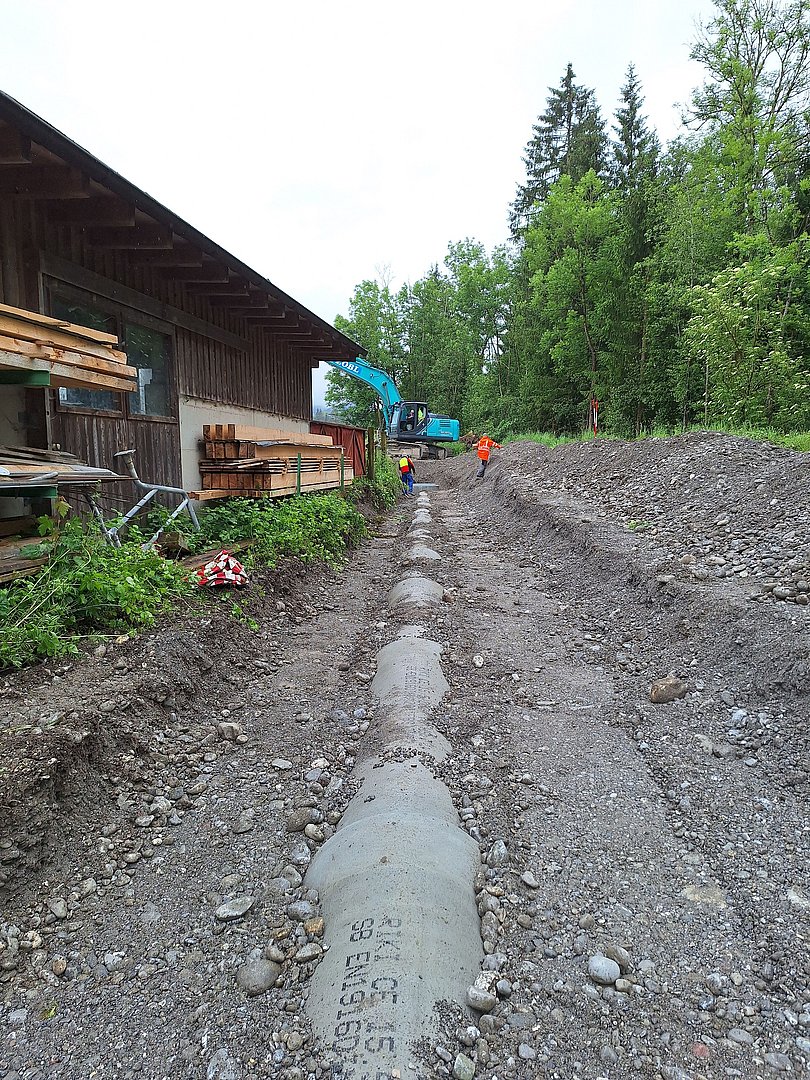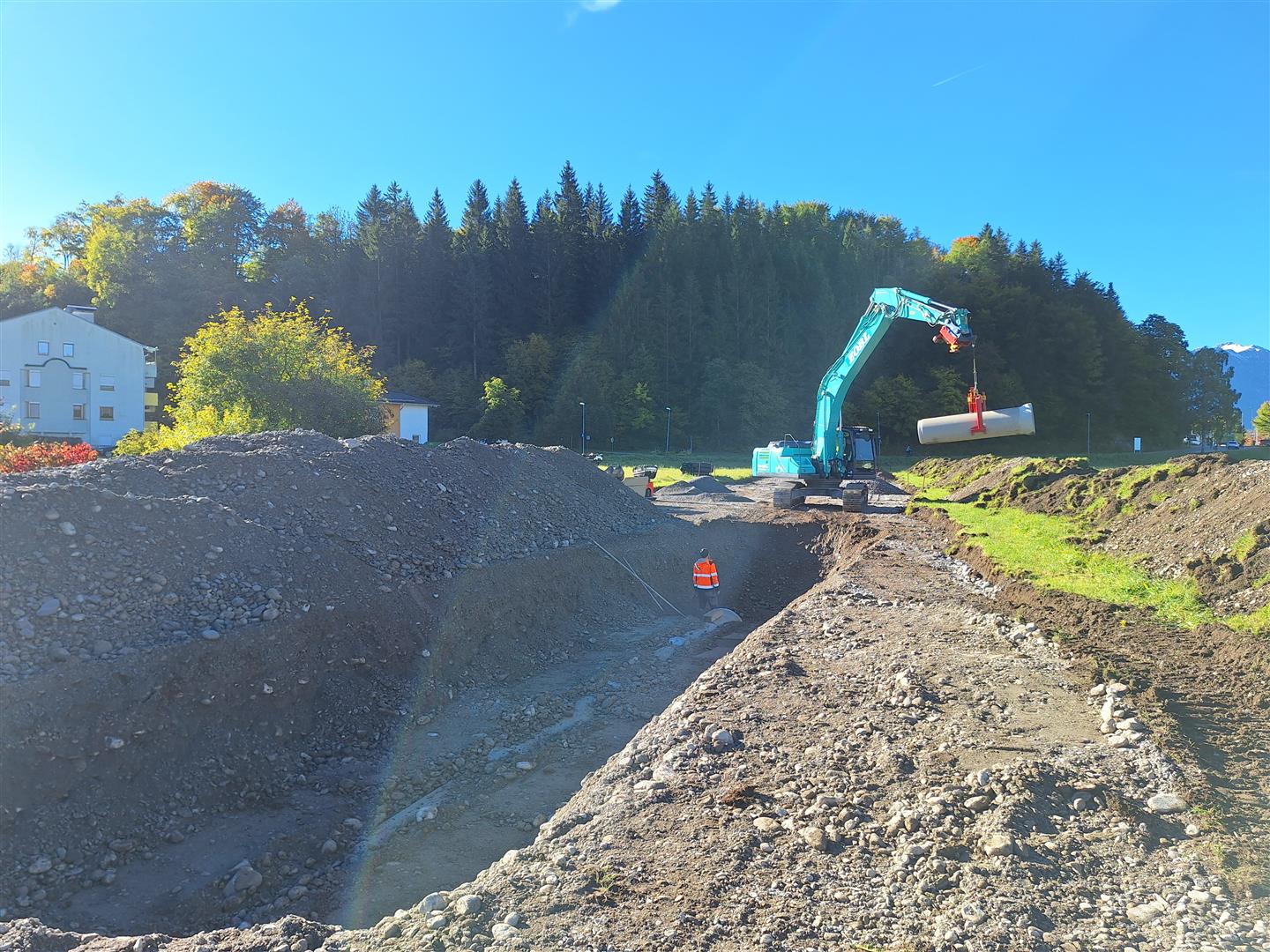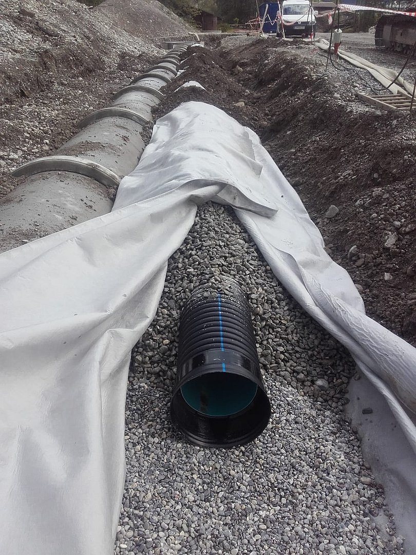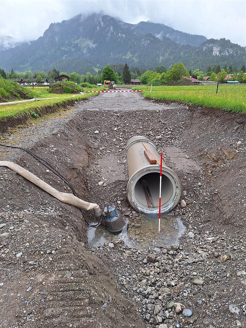 Insgesamt werden in diesem Bauabschnitt ca. 1500 m Betonrohre mit einem Durchmesser von 60cm bis 100cm und ca. 800 m Drainagerohre verlegt. Für den Erddamm werden ca. 25.000 m3 Dammschüttmaterial benötigt.