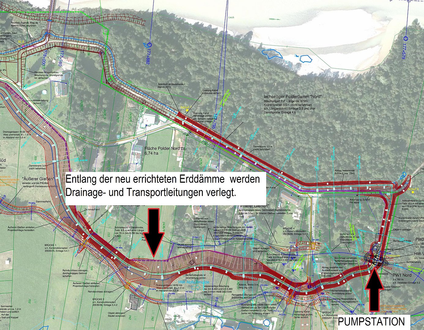 Ein Polder schützt vor Hochwasser, indem er durch Erddämme ein gefährdetes Gebiet umschließt. Bei einem Katastrophen Hochwasser überflutet der Lech sämtliche Felder der Lüß. In diesem Fall liegt der Wasserspiegel des hochwasserführenden Lech über dem Bodenniveau der geschützten innenliegenden Fläche. Darum muss das Wasser aus den Entwässerungsgräben des Polders über bzw. durch den Erddamm gepumpt werden. In diesem Abschnitt 1 werden insgesamt über 2.000m Drainagerohre und Transportleitungen verlegt und zu einer Sammelstelle im nördlichen Teil des Polders geleitet. Dort wird dann das anfallende Wasser mittels einer Pumpstation über den Polder in den hochwasserführenden Lech abgeleitet.