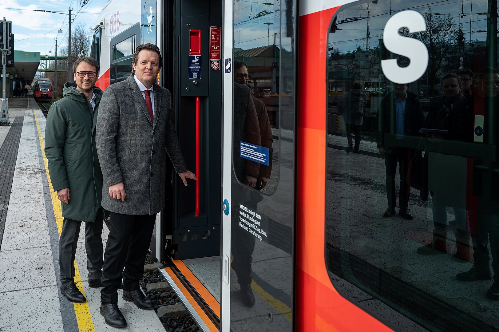 Mobilitätslandesrat René Zumtobel traf sich heute in Bregenz mit seinem Vorarlberger Amtskollegen Daniel Zadra zu einem Arbeitsgespräch rund um die Weiterentwicklung des öffentlichen Schienenverkehrs. Im Rahmen seines Antrittsbesuches beim westlichen Nachbarn machte sich Landesrat Zumtobel am Bahnhof Bregenz ein Bild von der Qualität der neuen Nahverkehrszüge, die in Vorarlberg seit Dezember 2022 im Einsatz sind. „Ich habe mir heute persönlich ein Bild von der neuen Zuggarnitur gemacht, die ab Herbst auch in Tirol unterwegs sein wird. Mit 290 Sitzplätzen pro Zug können wir 100 Fahrgäste zusätzlich mitnehmen und damit das Platzangebot um ein Drittel erhöhen. Mit den 20 neuen Garnituren schaffen wir also höhere Fahrtgastkapazitäten und können damit auch das Zugangebot in Tirol weiter ausbauen“, so Zumtobel.  Die neuen Züge verfügen beispielsweise über barrierefreie, niveaugleiche Einstiege sowie Rollstuhlplätze und behindertengerechte WCs. Mehr Beinfreiheit, Klimaautomatik, Steckdosen mit USB, ausklappbare Laptoptische und WLAN sind weitere Vorzüge der hochmodernen Garnituren. In jedem Einstiegsbereich gibt es Kinderwagenabstellplätze, zudem befindet sich ein Wickeltisch im barrierefreien WC.