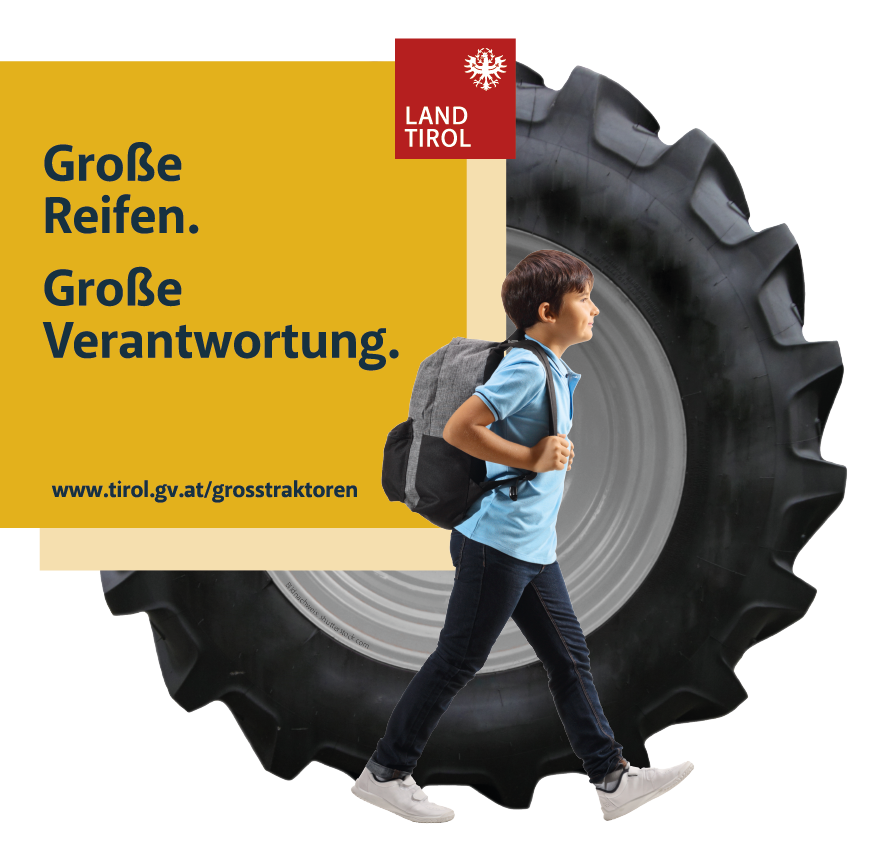 Großtraktoren überragen beinahe alle anderen am Verkehr Teilnehmenden um ein Vielfaches. Das löst oft ein mulmiges Gefühl aus – vor allem dann, wenn die Straßen im Ortsgebiet eng sind und der Abstand gering ist. Mit der neuen Informationskampagne des Landes Tirol ersuchen wir Sie im Sinne eines guten Miteinanders und höchstmöglicher Sicherheit im Straßenverkehr, über die gesetzlichen Vorschriften hinaus besondere Rücksicht zu nehmen.