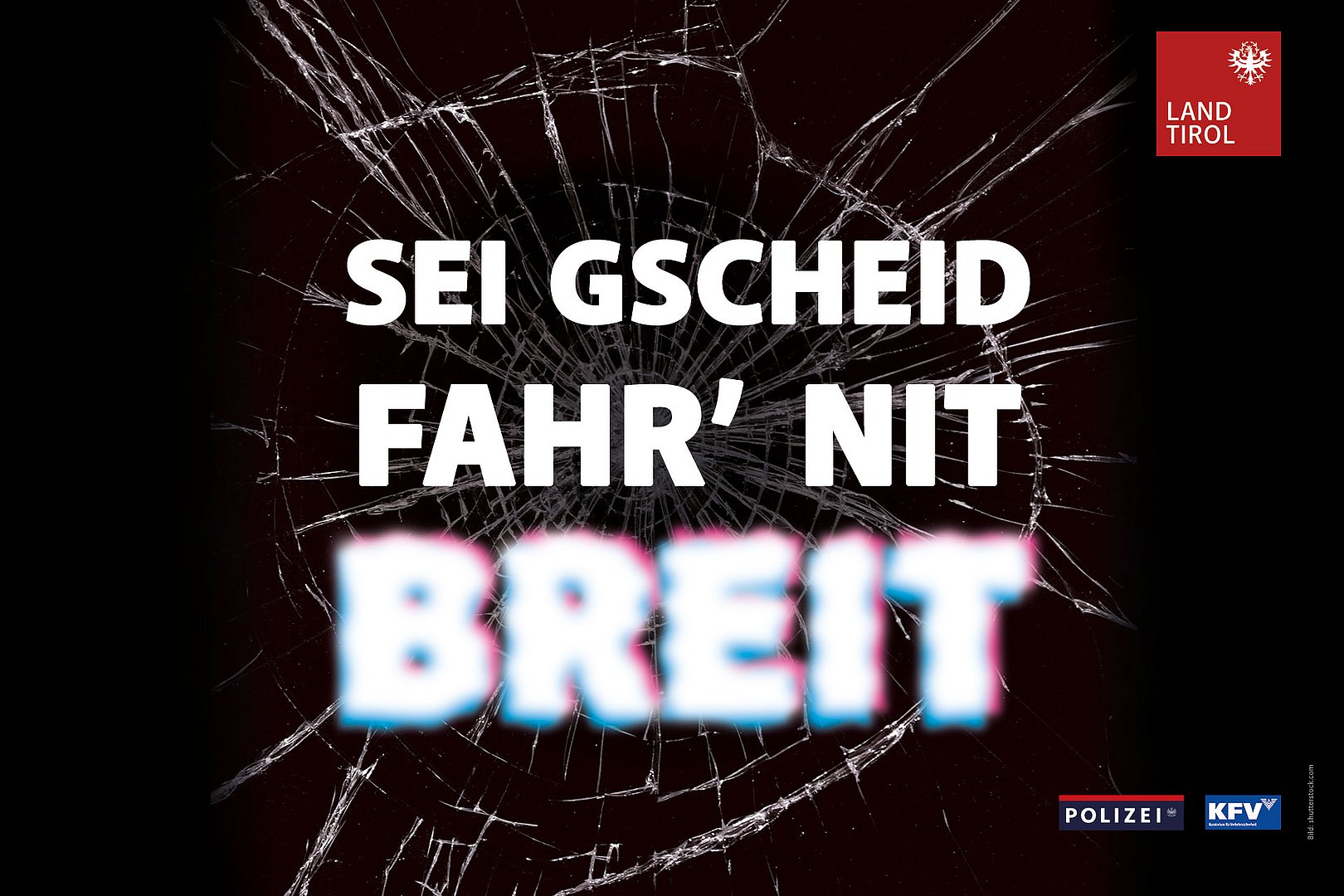 Weiße Schrift auf schwarzem Hintergrund; angedeutet eine zerbrochene Frontscheibe eines Autos; Text: Sei gscheid, fahr nit breit