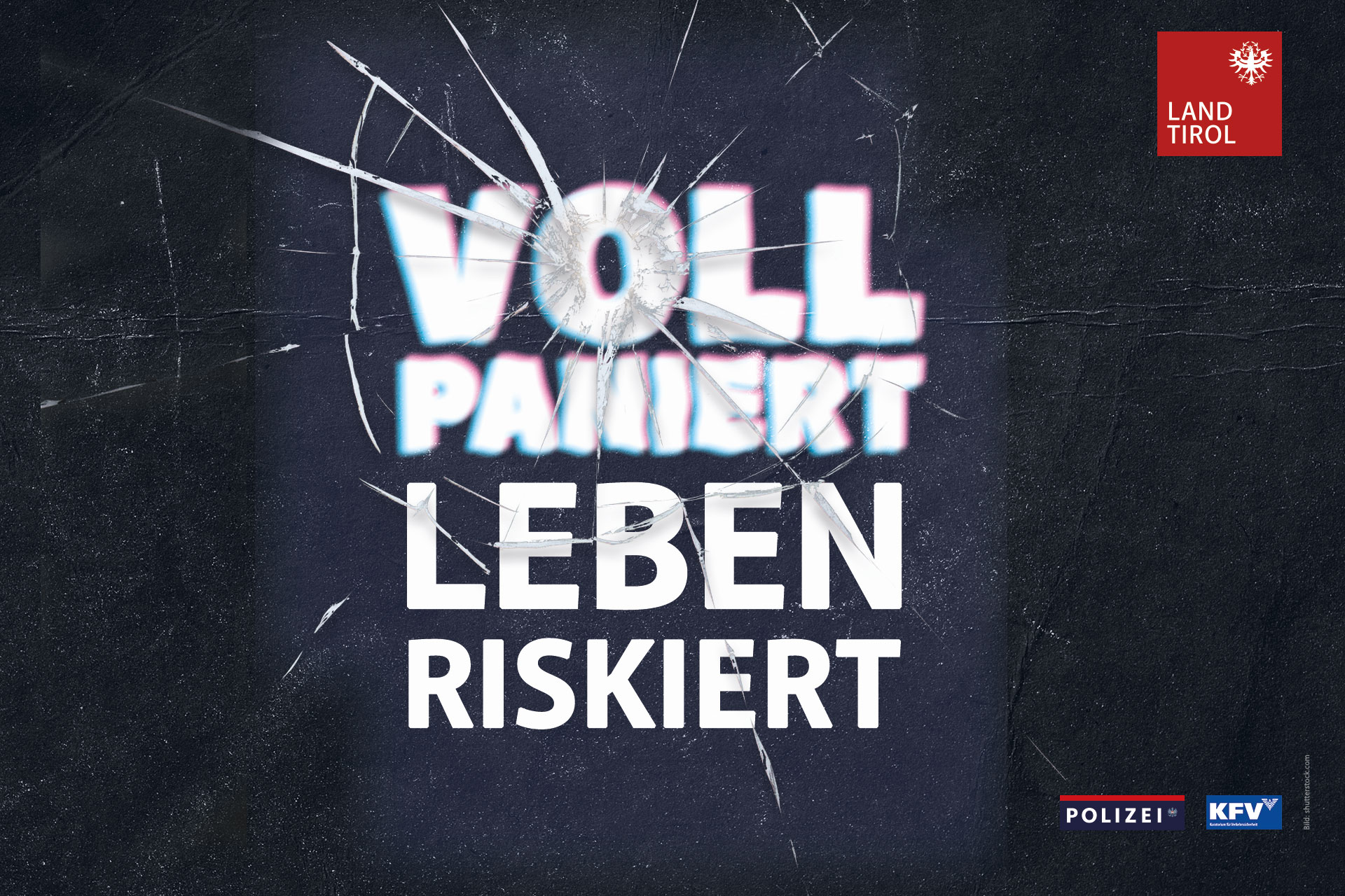 Weiße Schrift auf schwarzem Hintergrund; angedeutet eine zerbrochene Frontscheibe eines Autos; Text: Voll paniert. Leben riskiert.
